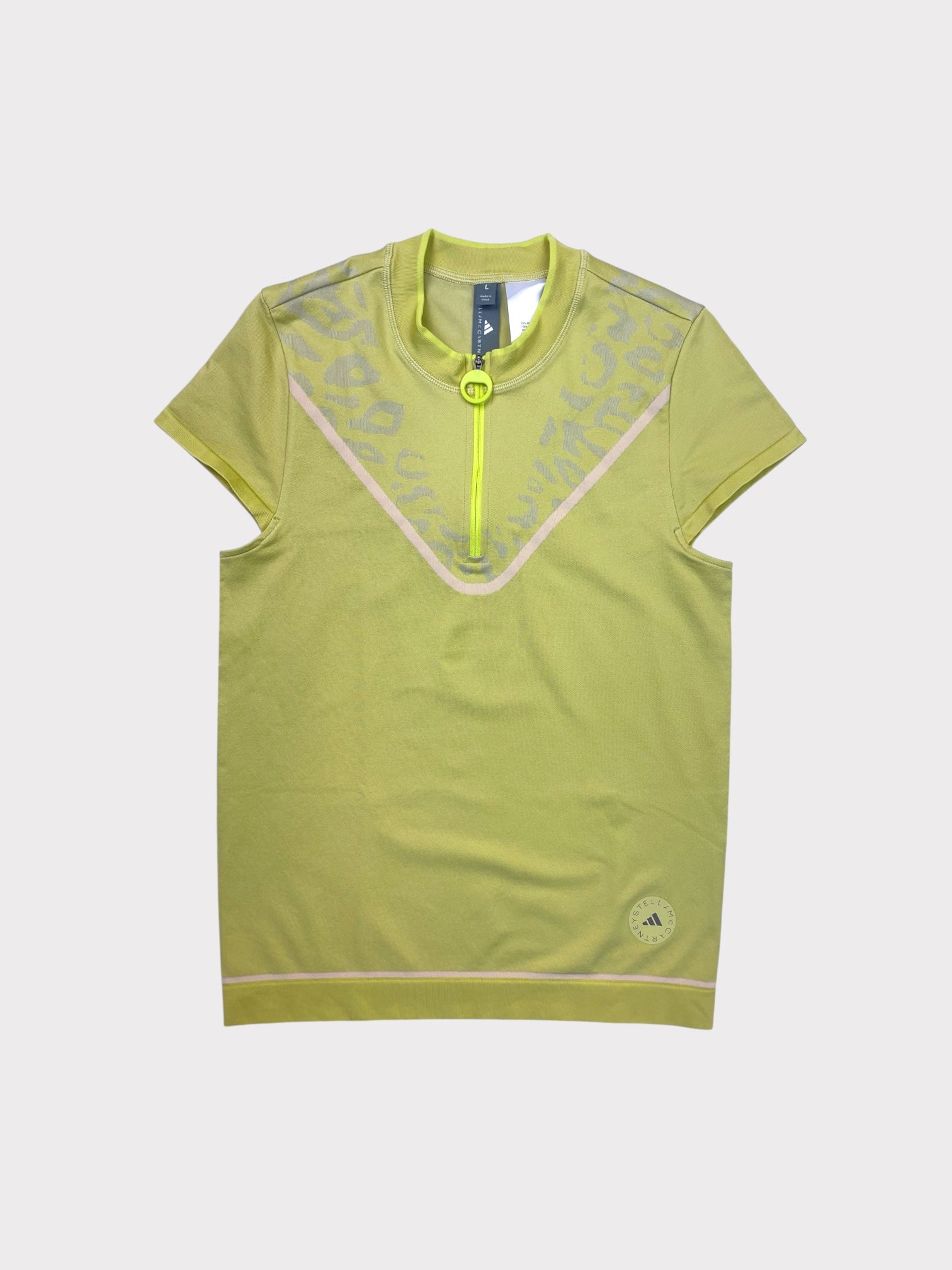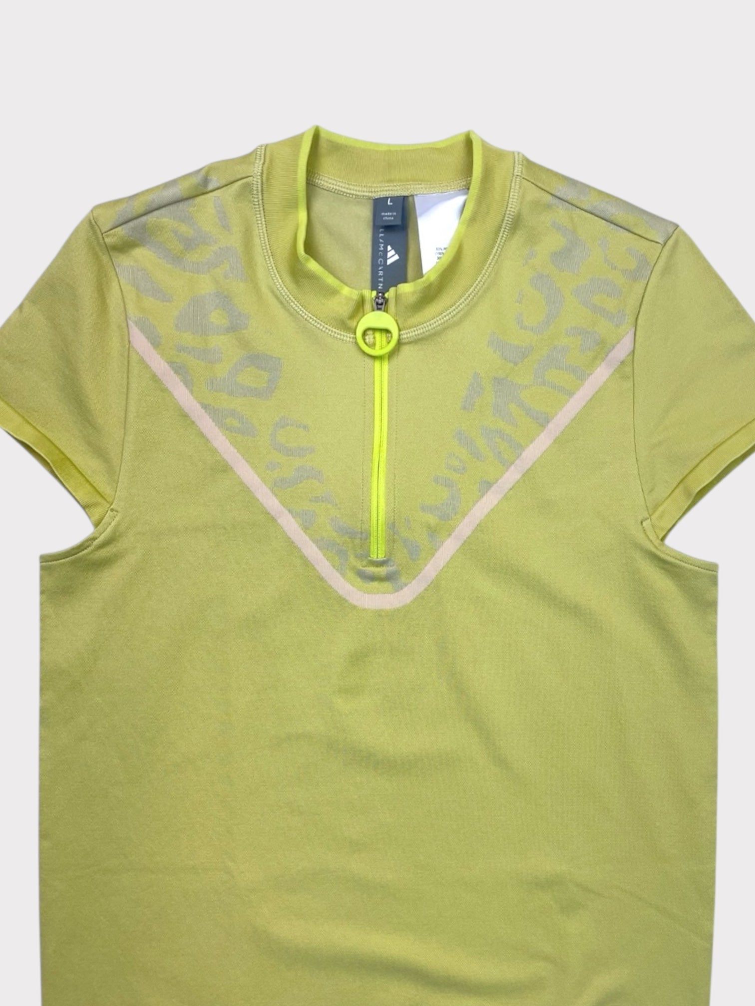Yellow zip up polo top with capped sleeves and jacquard animal print detail