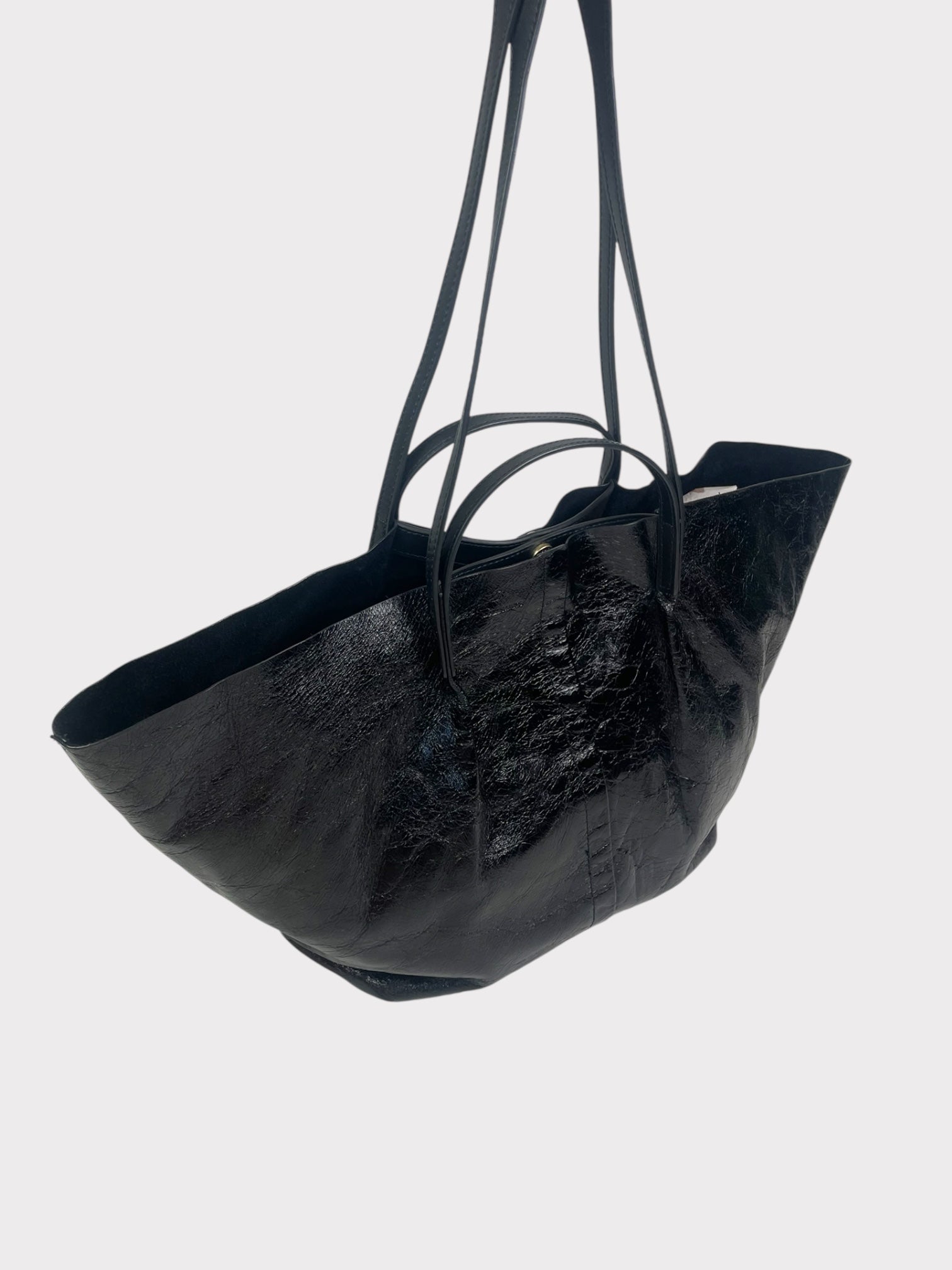 Black small textured leather tote bag with double handle detail