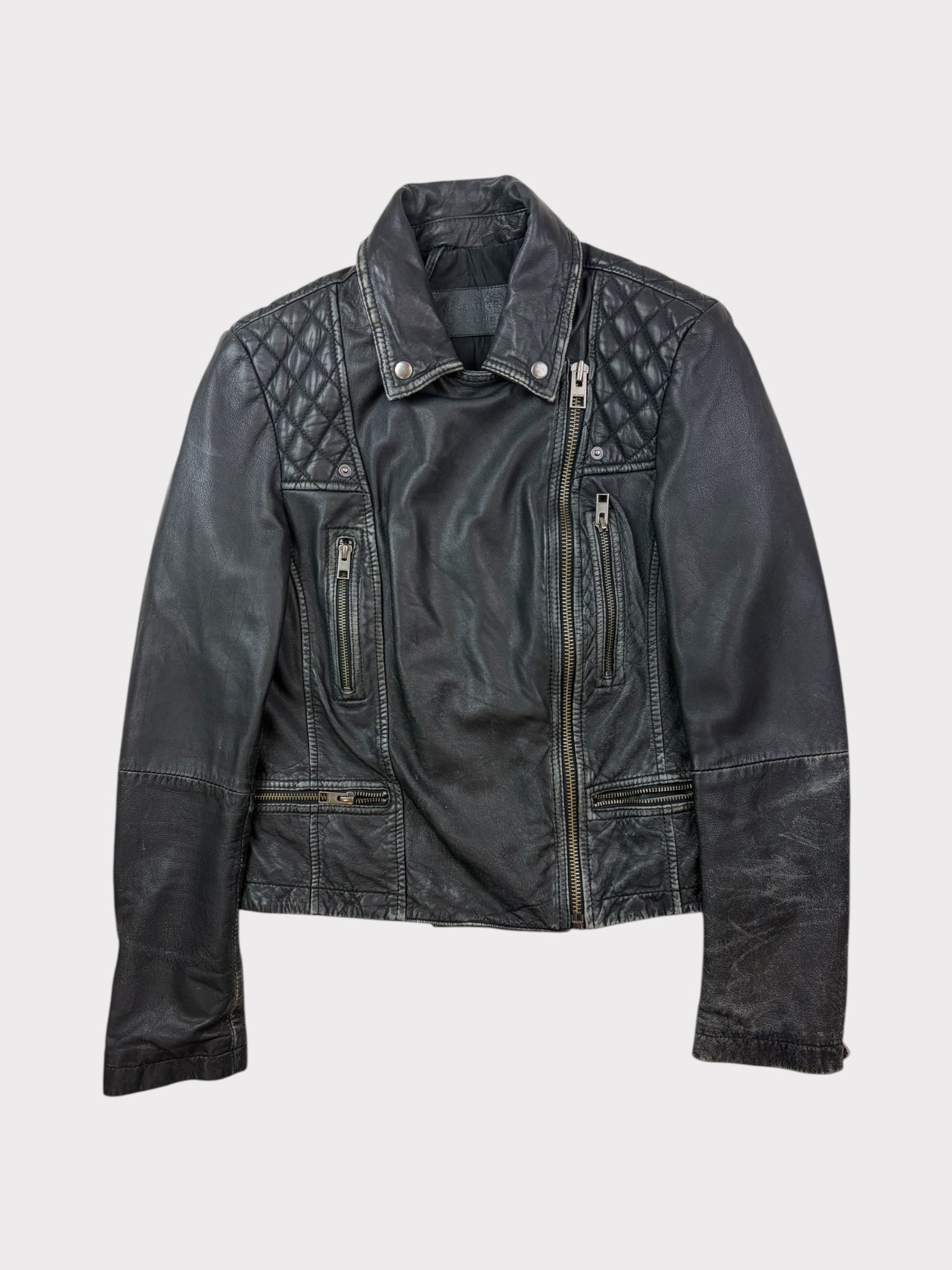 Distressed black leather biker jacket with quilting detail at shoulders and multiple zip details