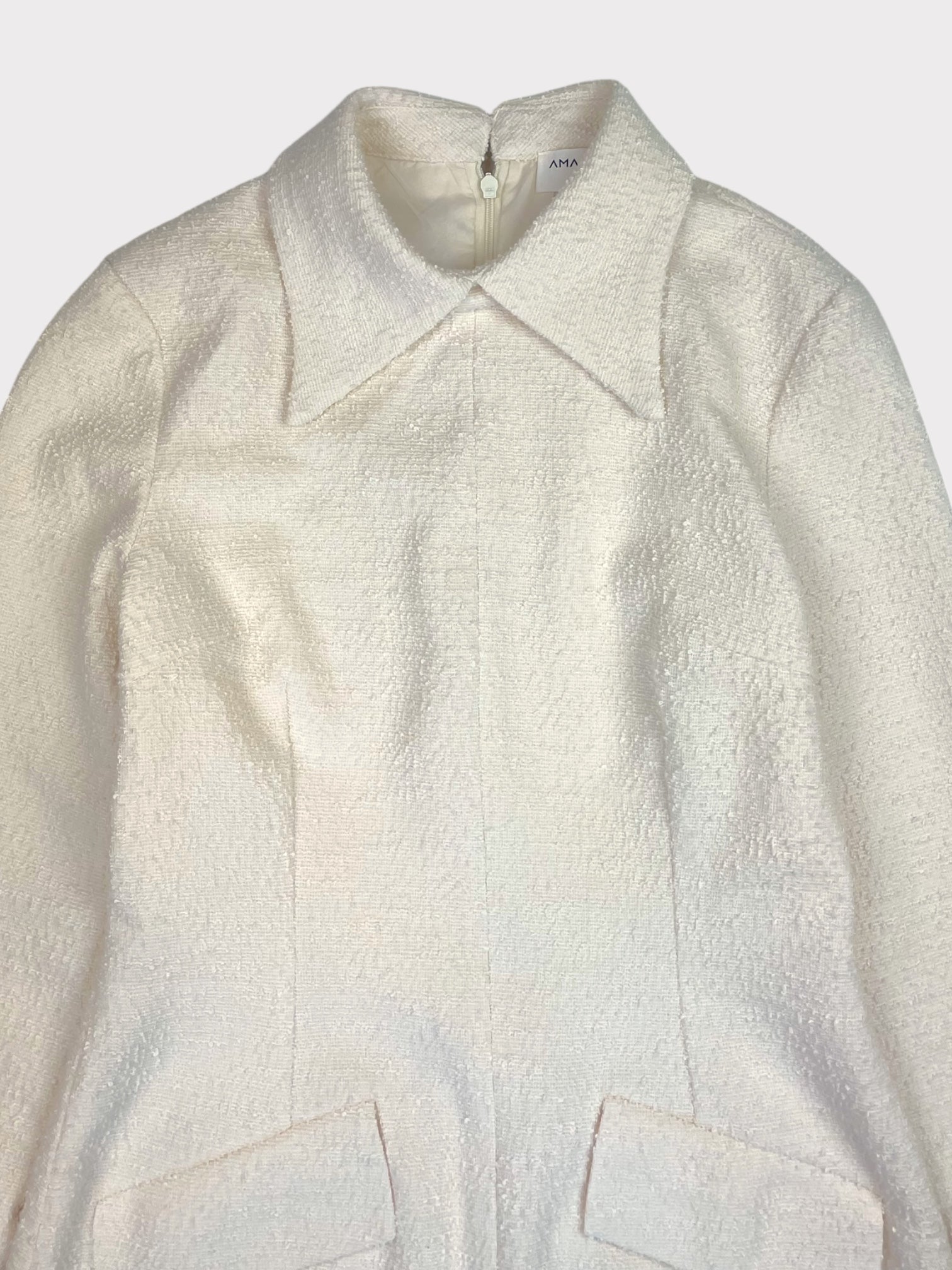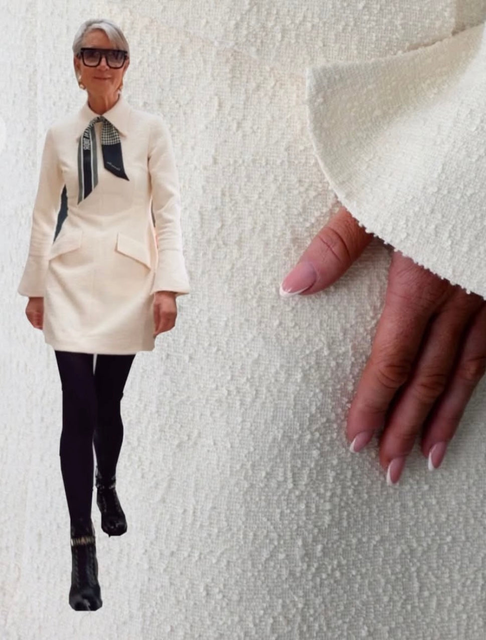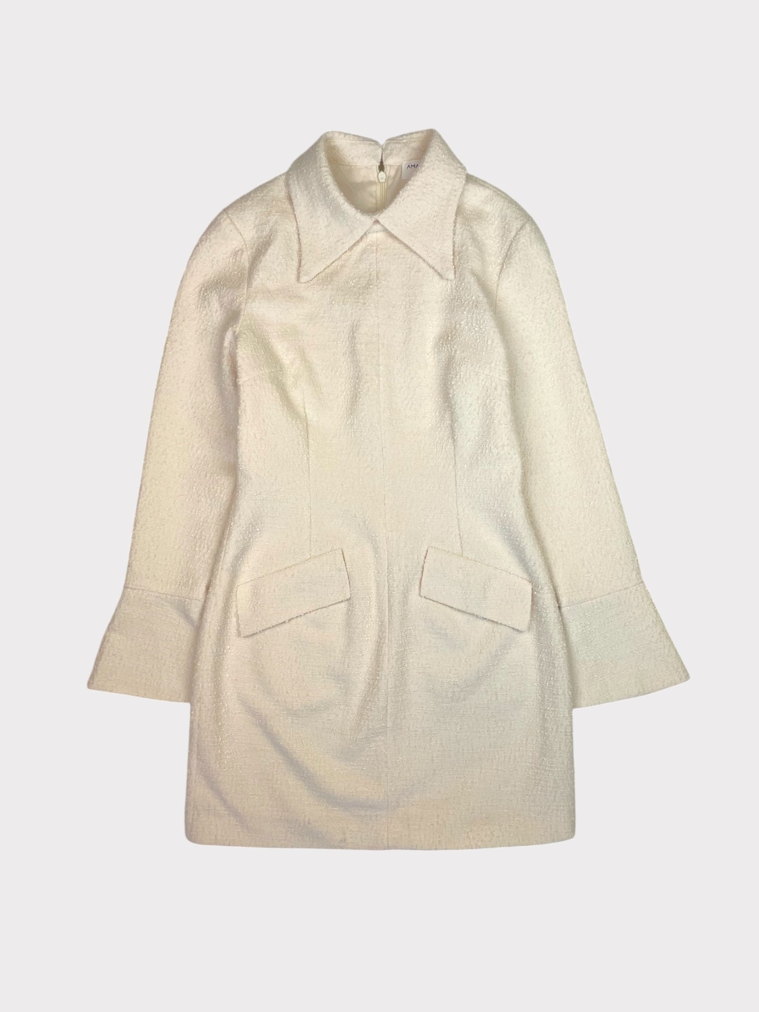 Cream boucle fabric collared dress with flared cuff and faux pocket detail