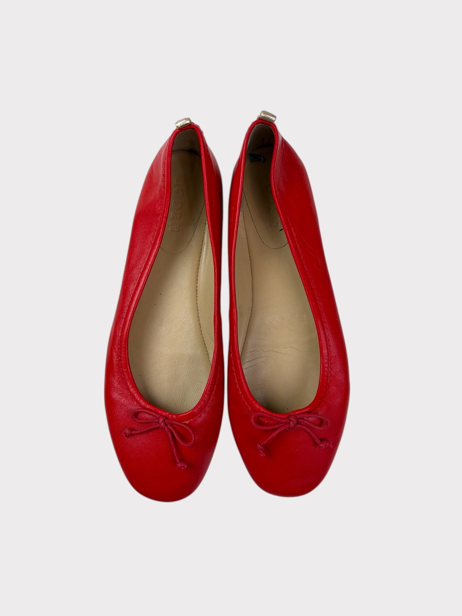 Red ballet flats with almond toe and bow detail at front and silver detail at back