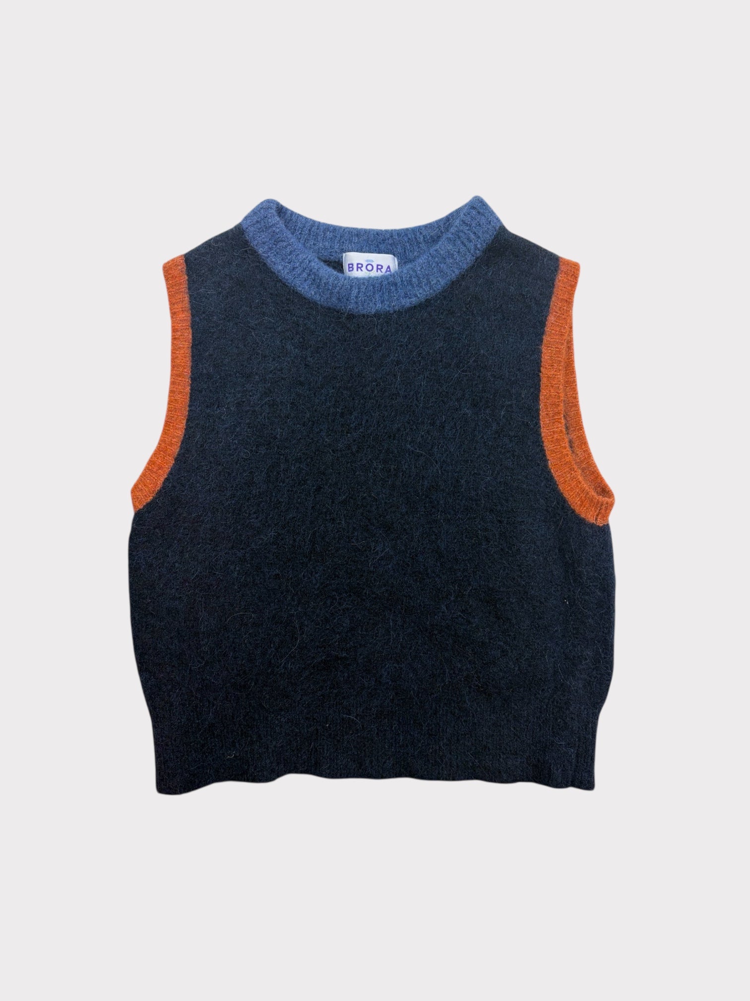Super soft navy alpaca blend knitted tank top with contrasting rib knit armholes and neck band