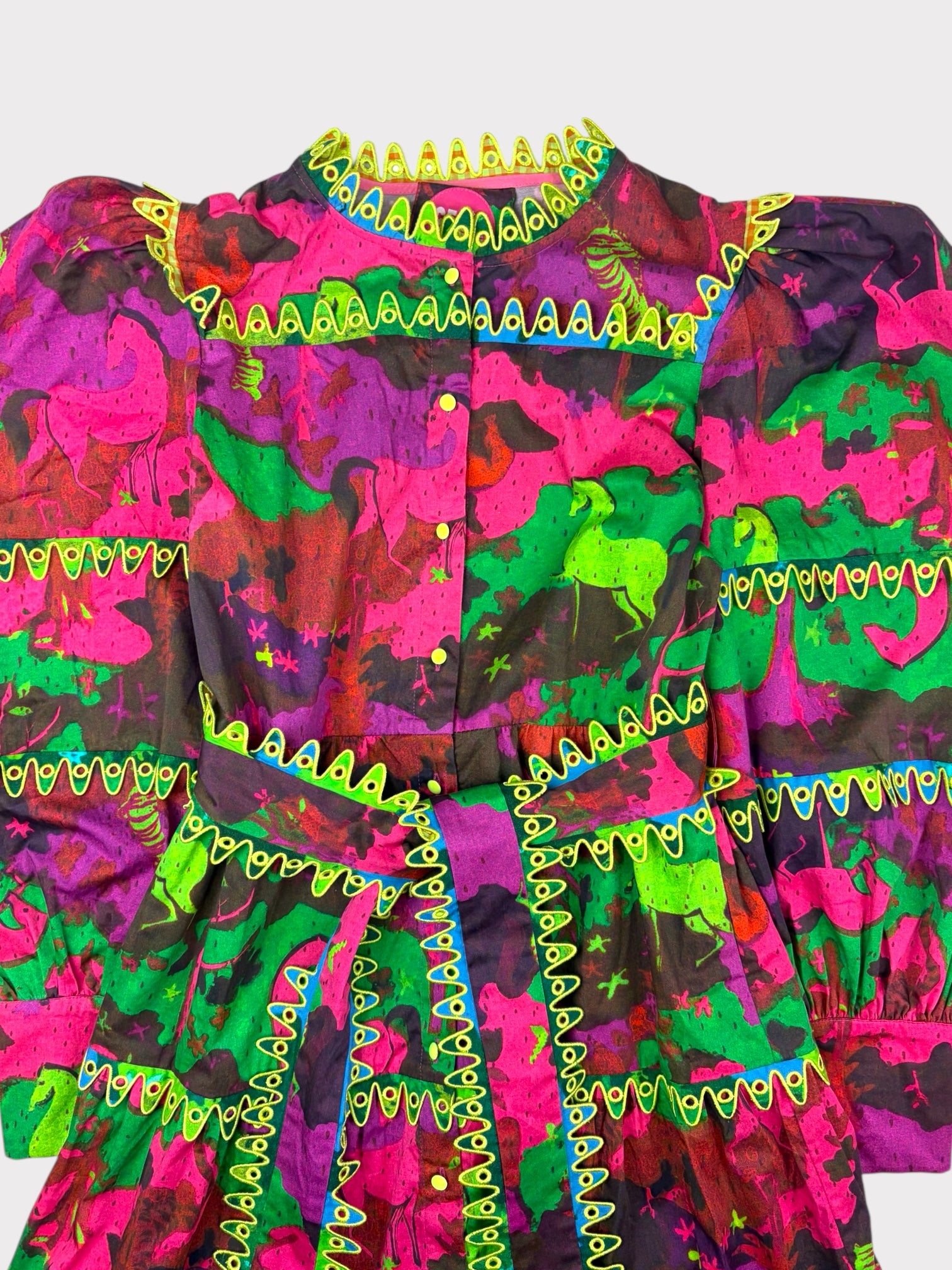 Bold printed button up tiered maxi dress with neon trim and contrasting button detail
