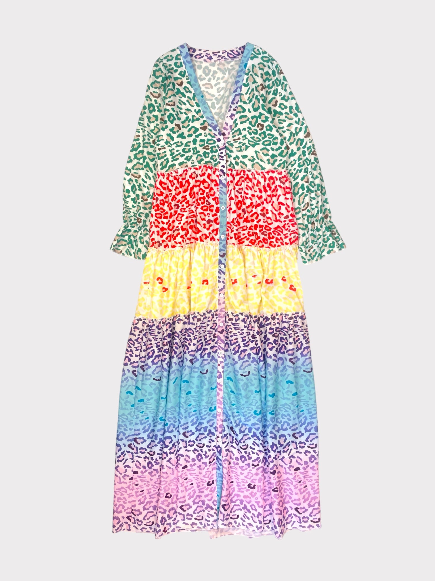 Multicoloured animal print tiered button up maxi dress with long sleeves and frilled cuffs