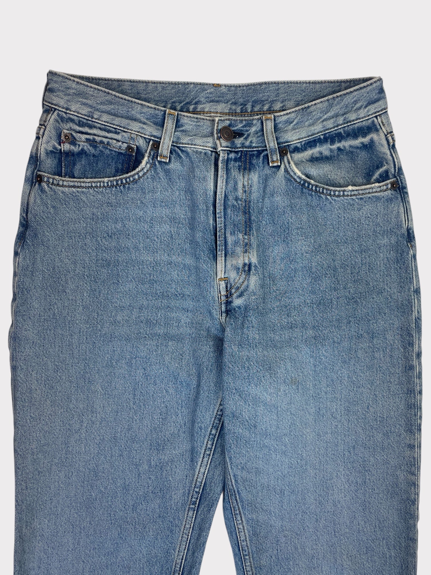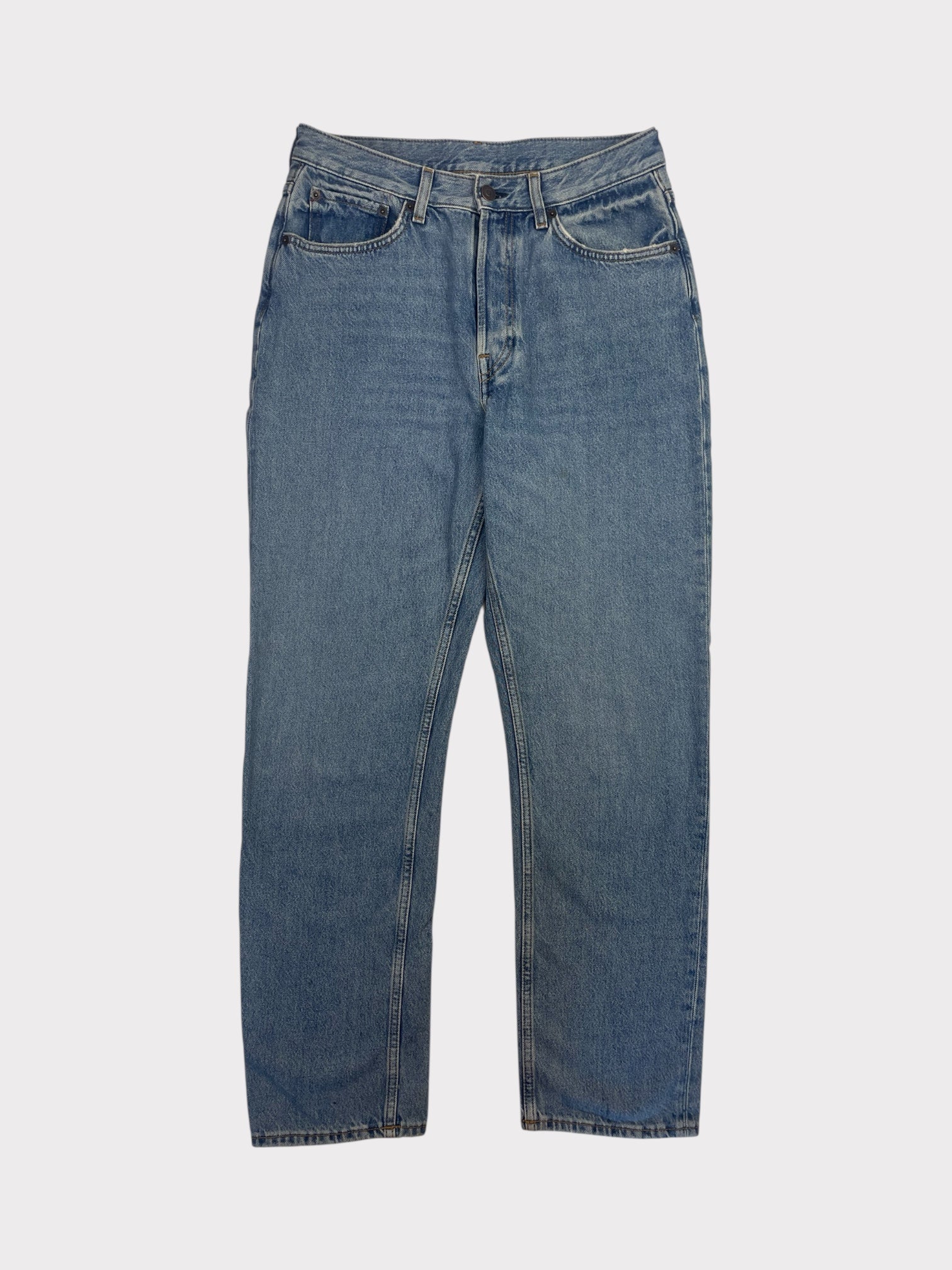 Mid blue denim straight leg jeans with button fly