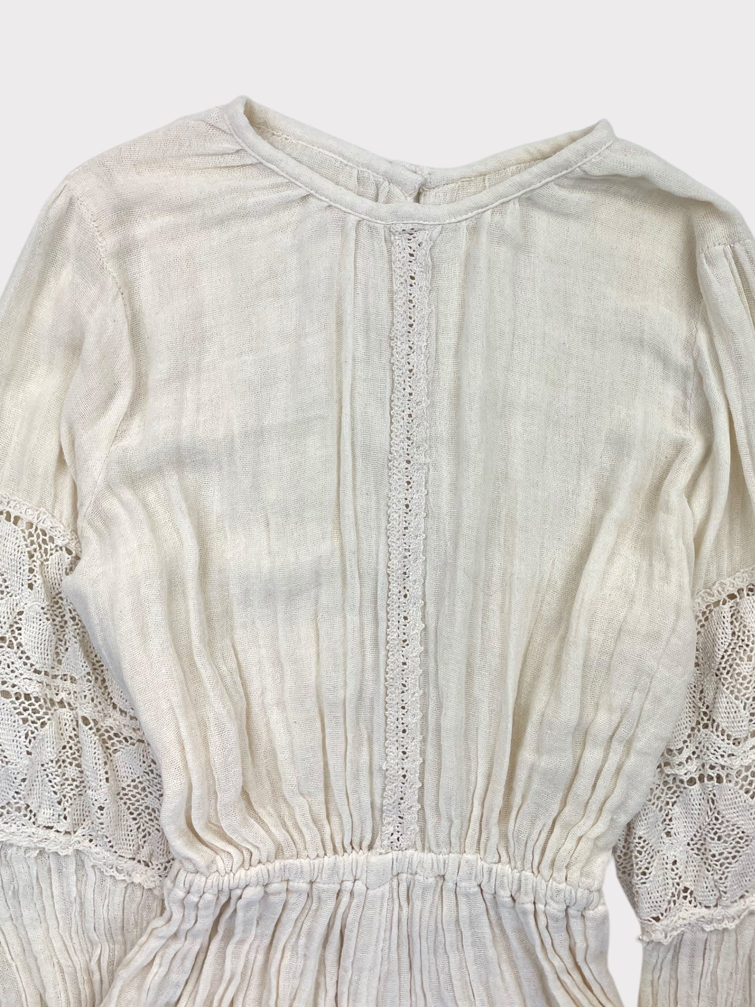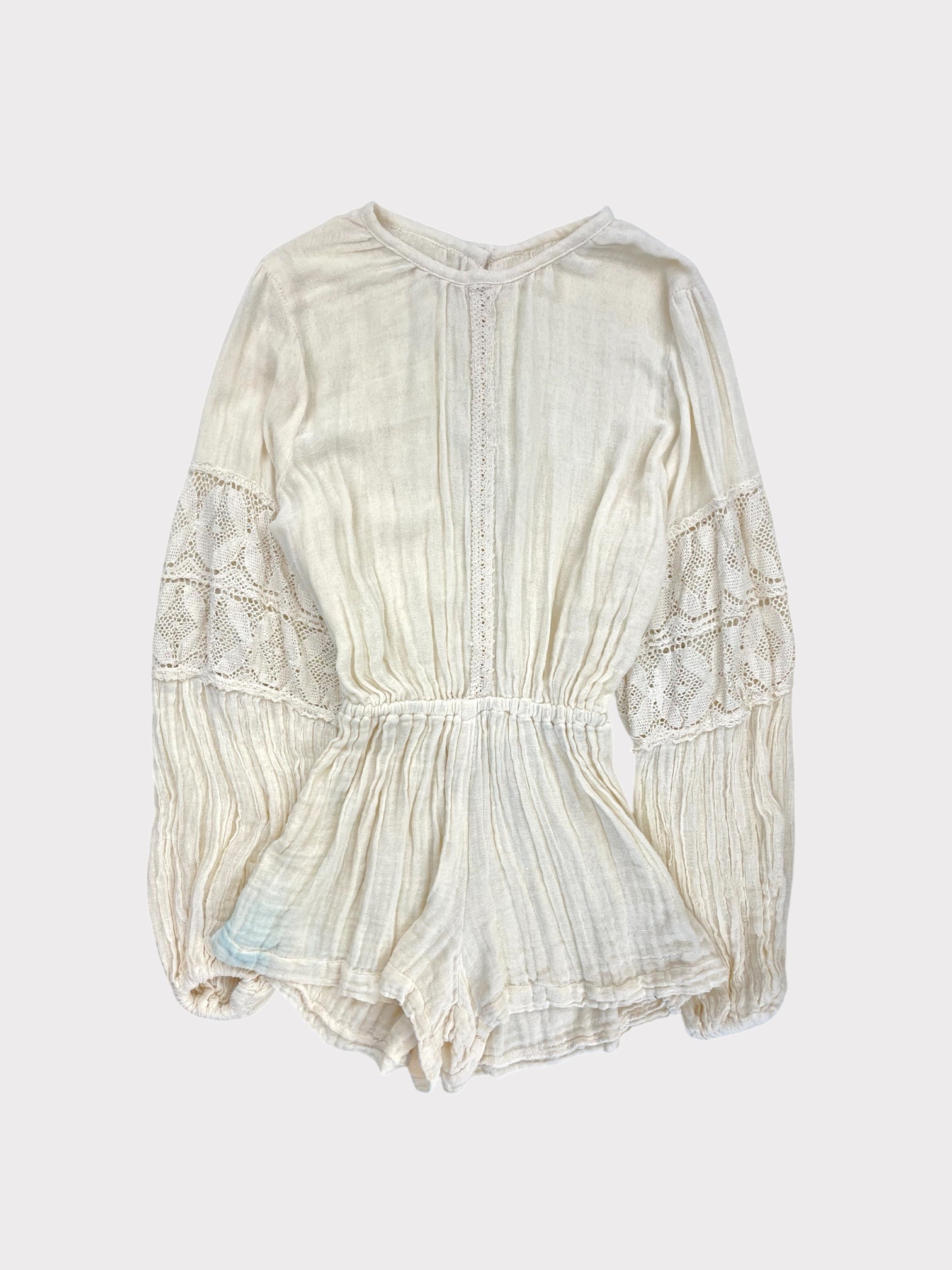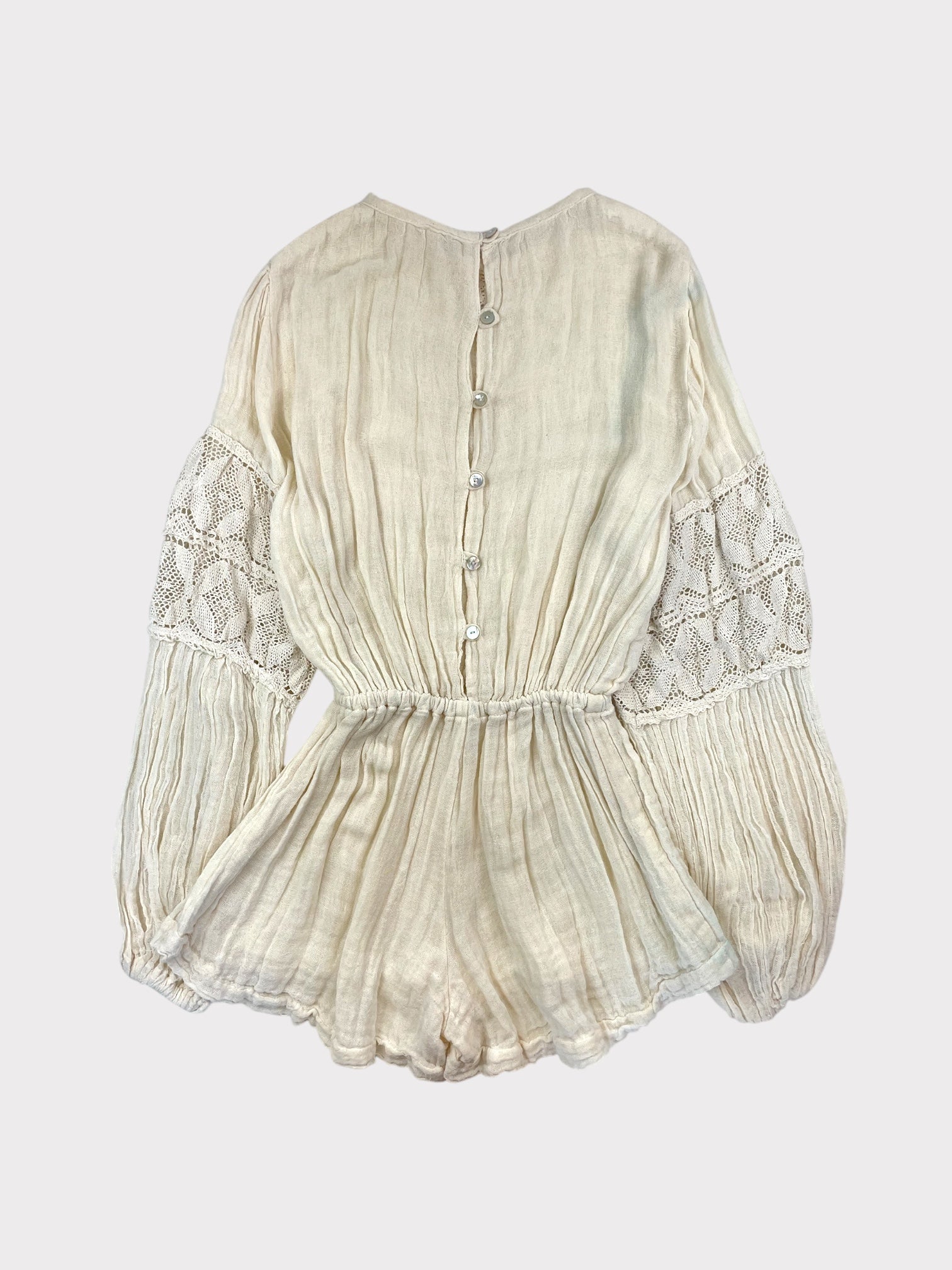 Cream crinkle muslin playsuit with crochet lace detail on sleeves