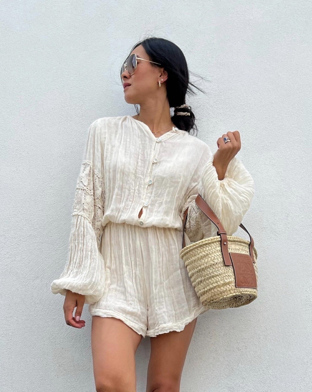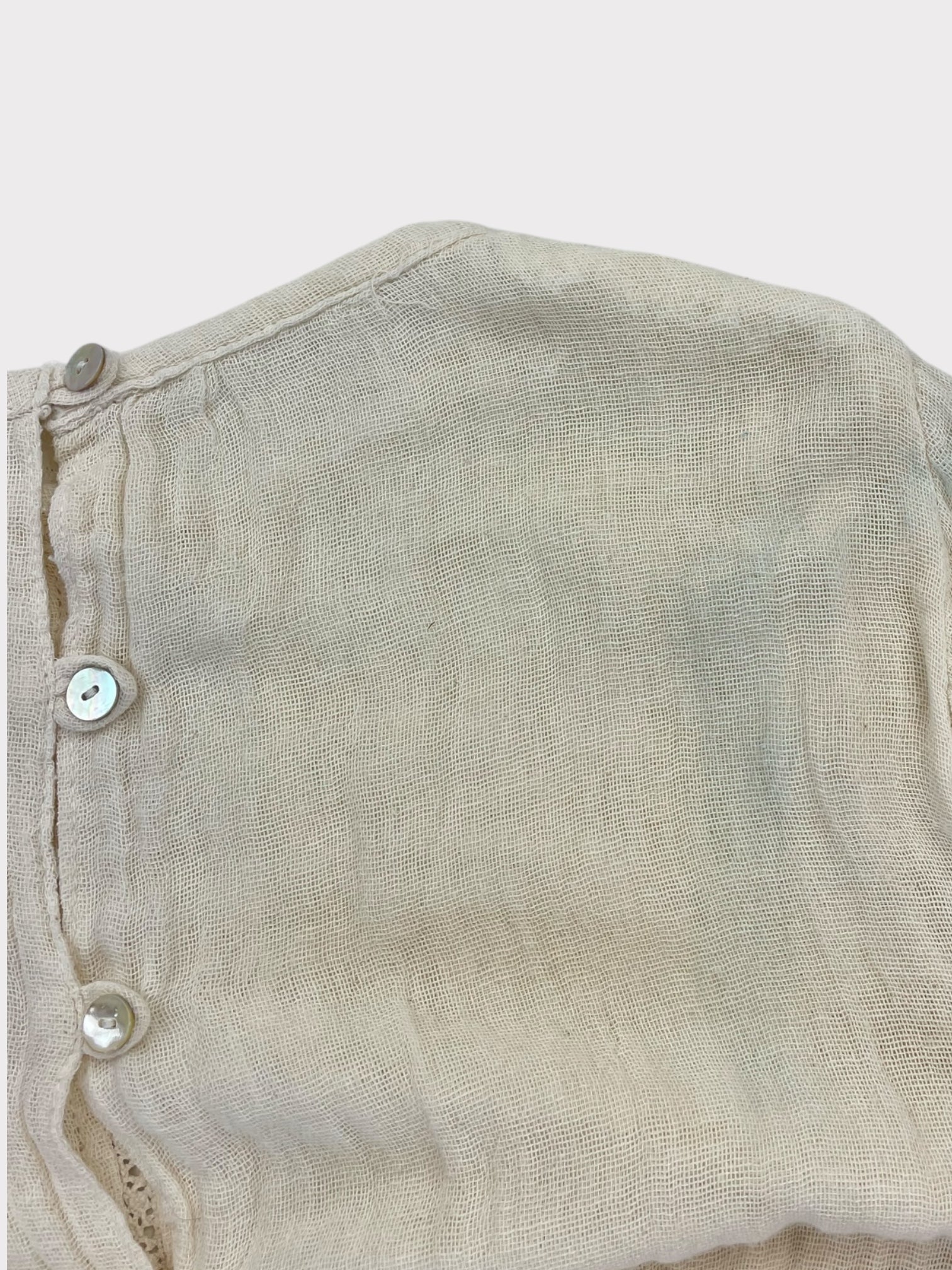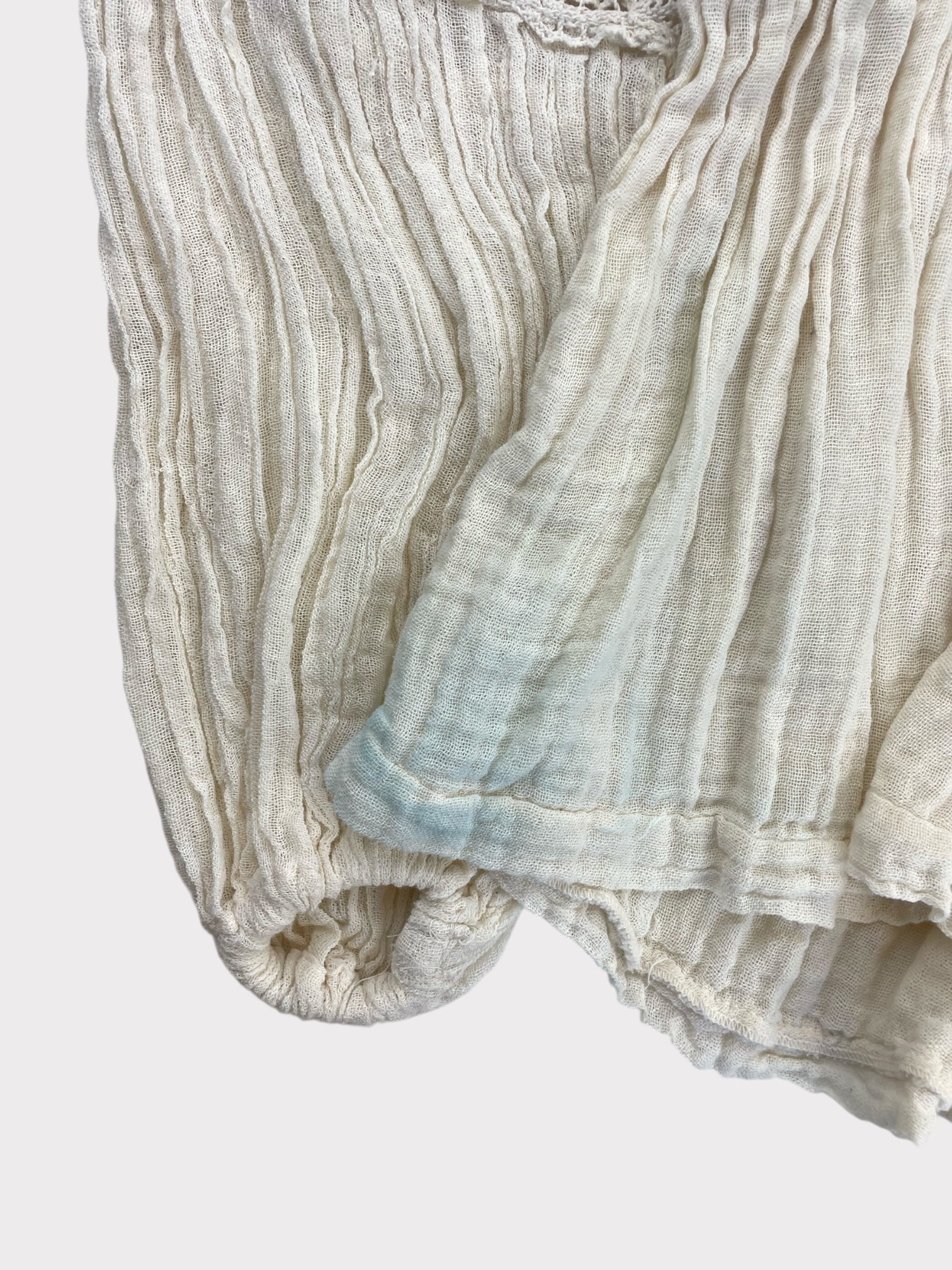 Cream crinkle muslin playsuit with crochet lace detail on sleeves