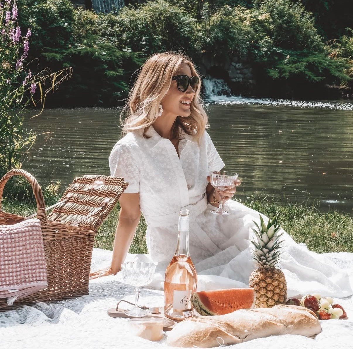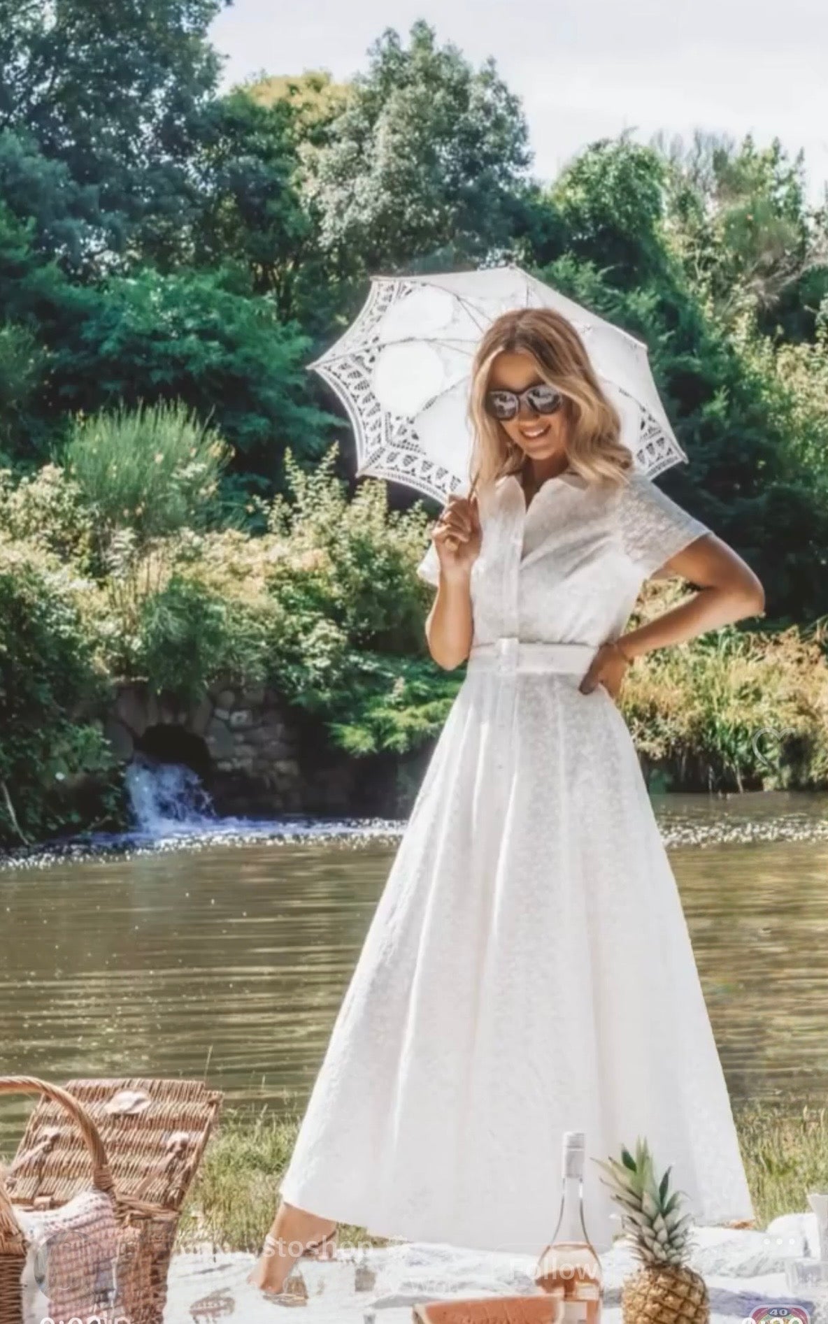 White broderie anglaise button-up midi dress with short sleeves and collar
