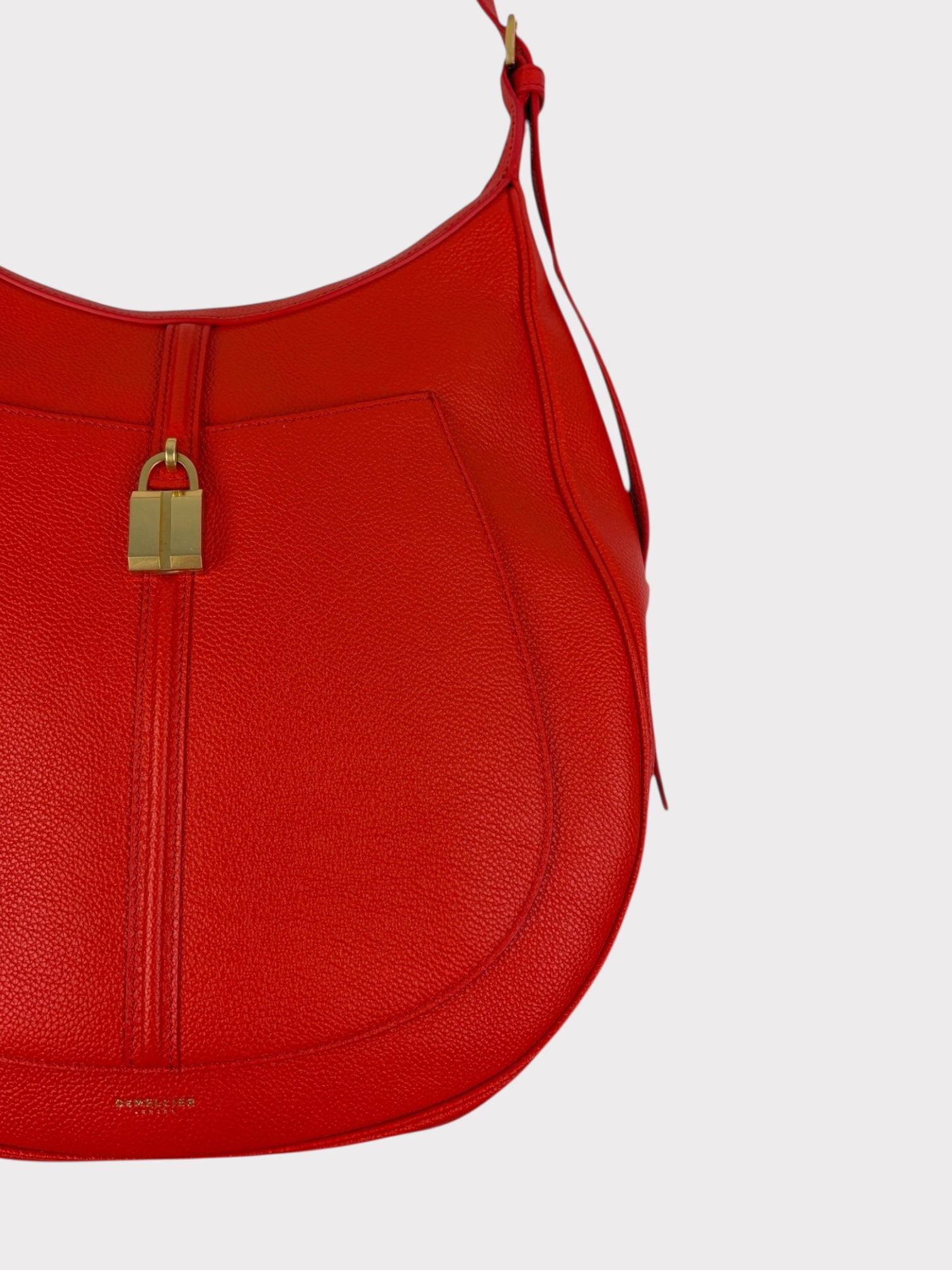Red grained leather hobo bag with pocket on front with gold tone magnetic closure detail