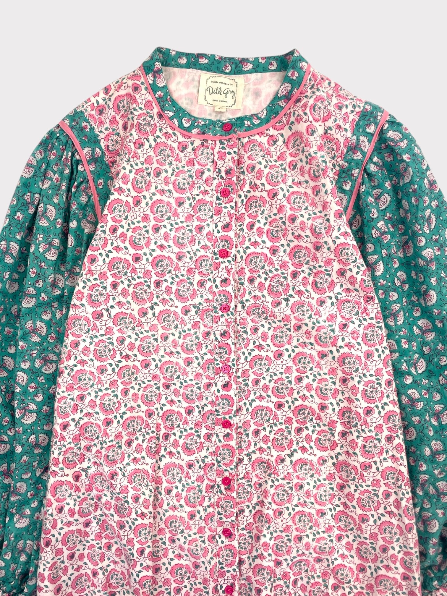 Pink ditsy floral print button up maxi dress with contrasting print sleeves and neck trim