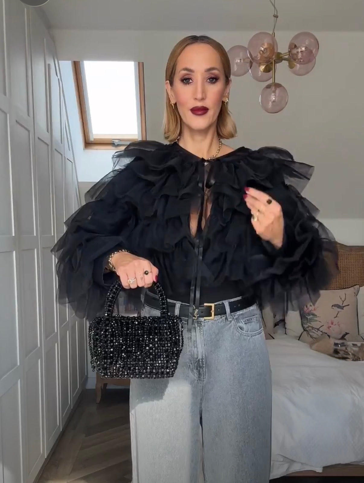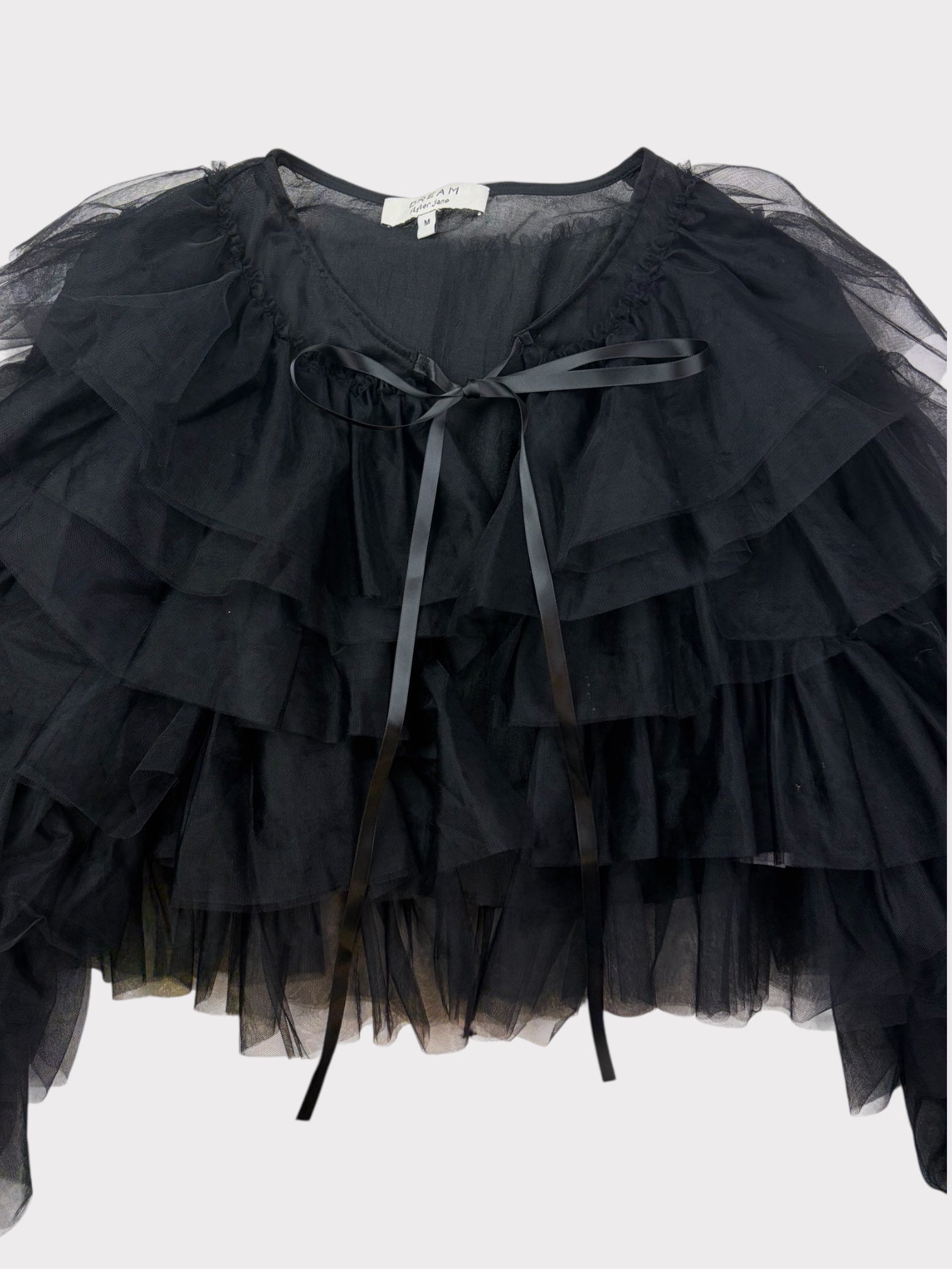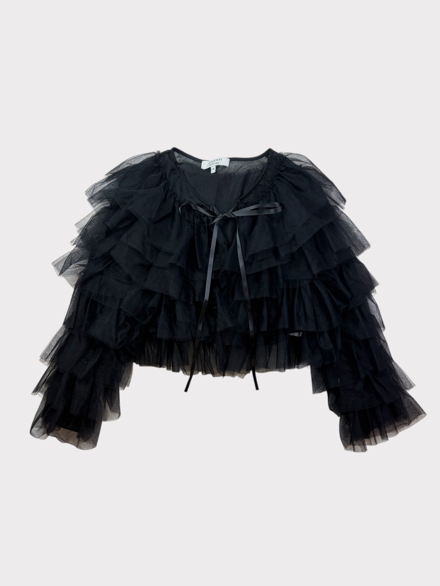 Black layered ruffle tulle jacket with long sleeves and single ribbon tie fastening at front neck
