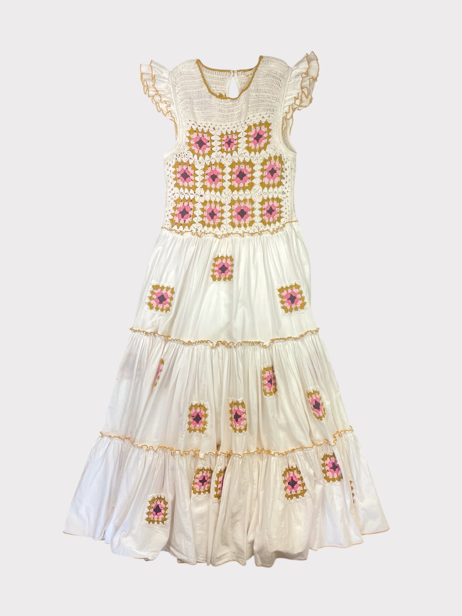 White maxi dress with pink and yellow crochet bodice and crochet panels in skirt
