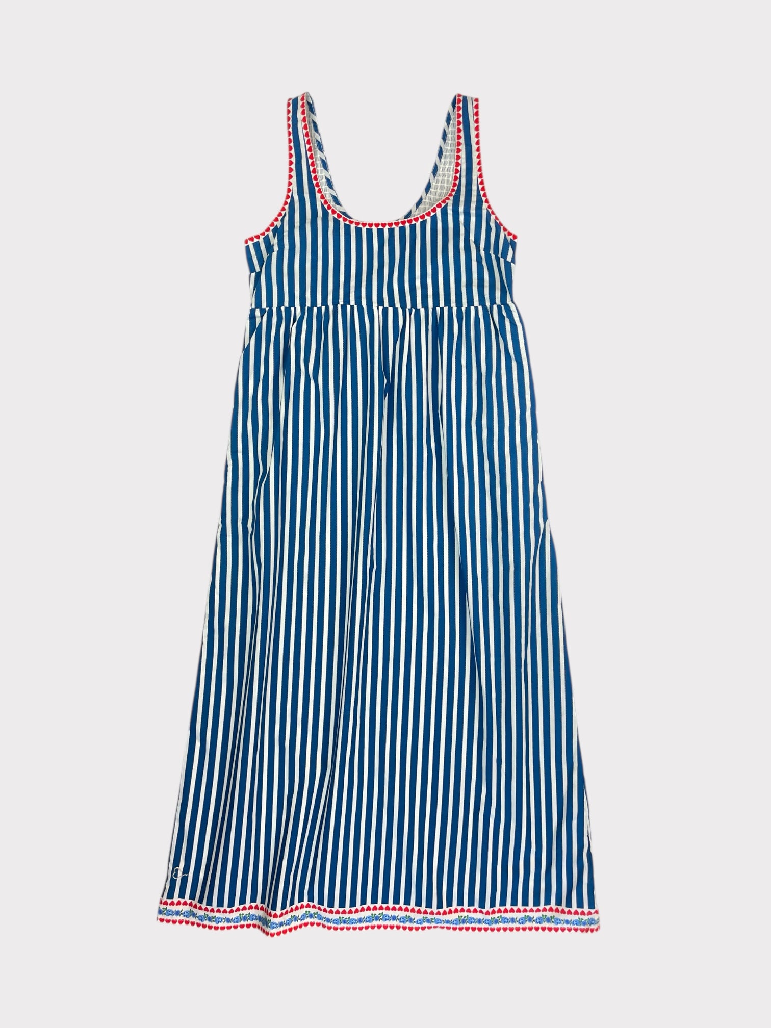 Blue and white striped maxi dress with red heart trim detail around neckline and hem