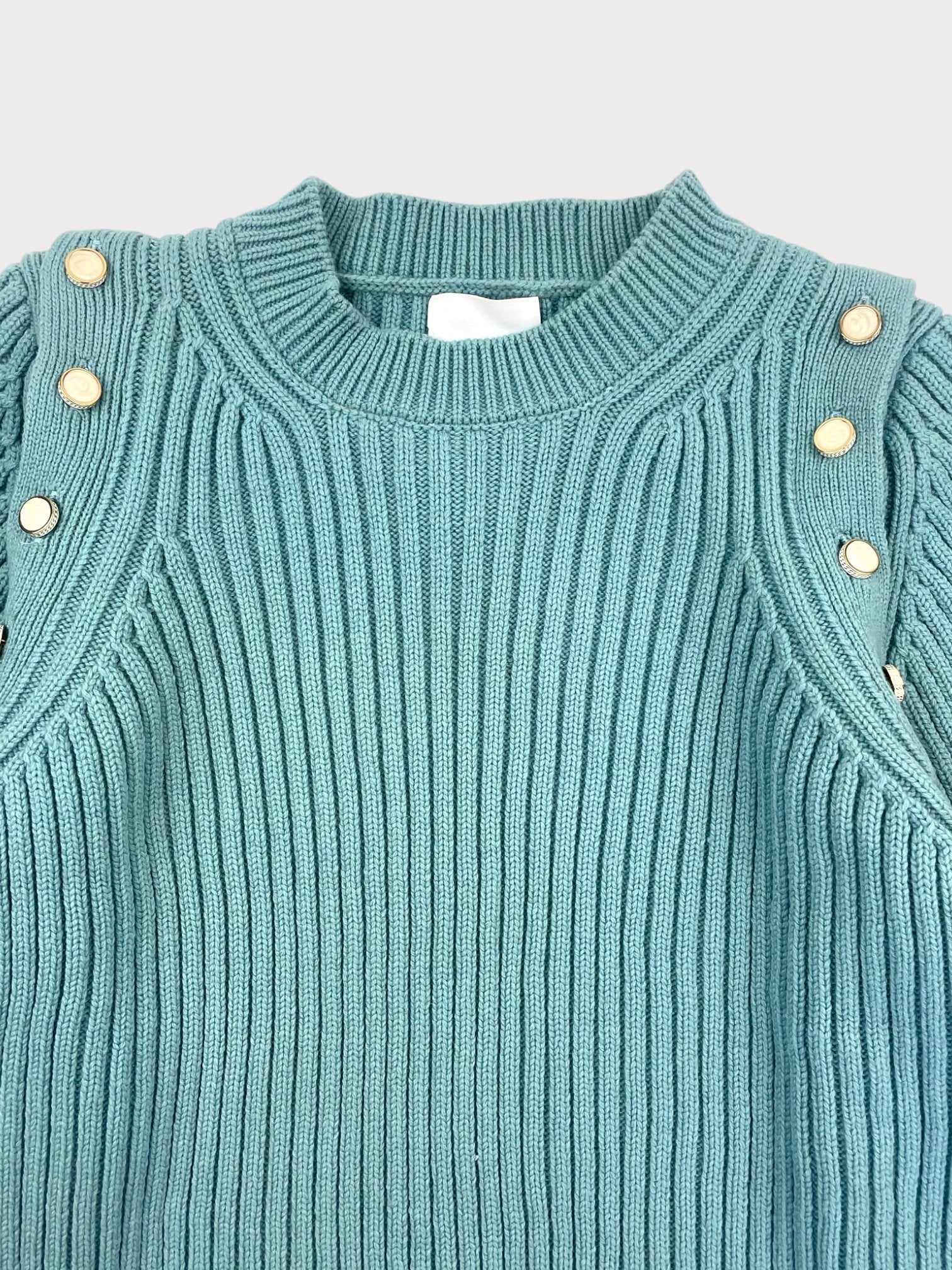 Blue chunky knitted rib jumper with voluminous sleeves and button detail around armholes which can be opened to reveal shoulders