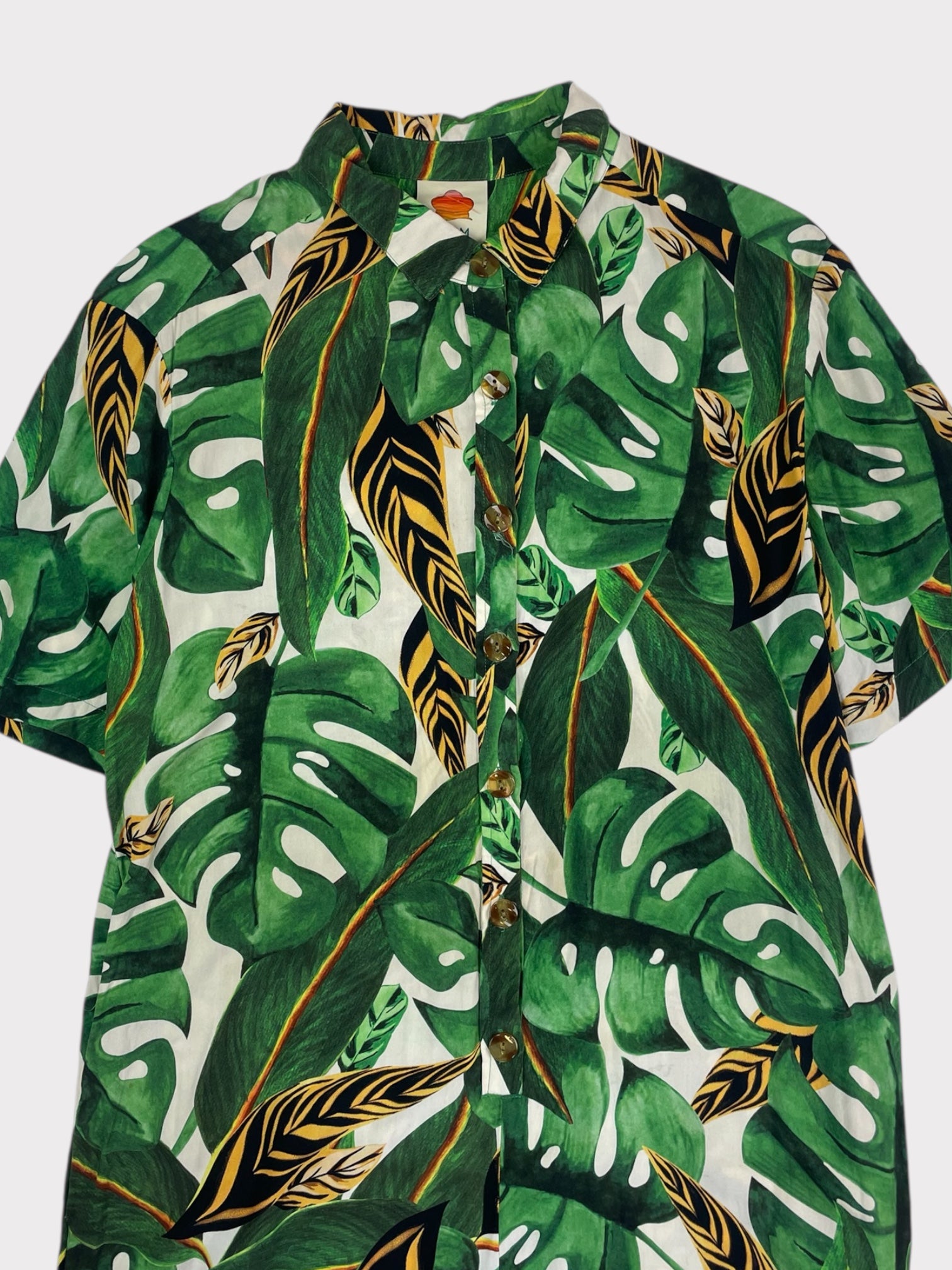 Bold leafy print button up jumpsuit with short sleeve and straight cropped leg