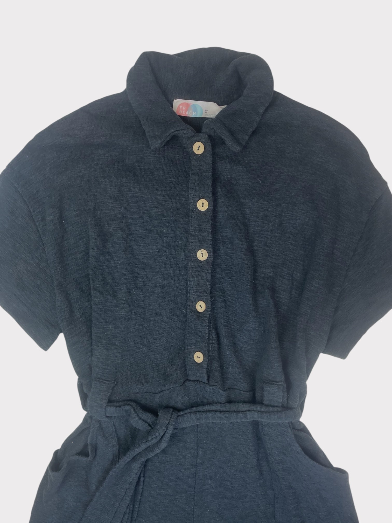 Black textured button up short sleeve jumpsuit with belt