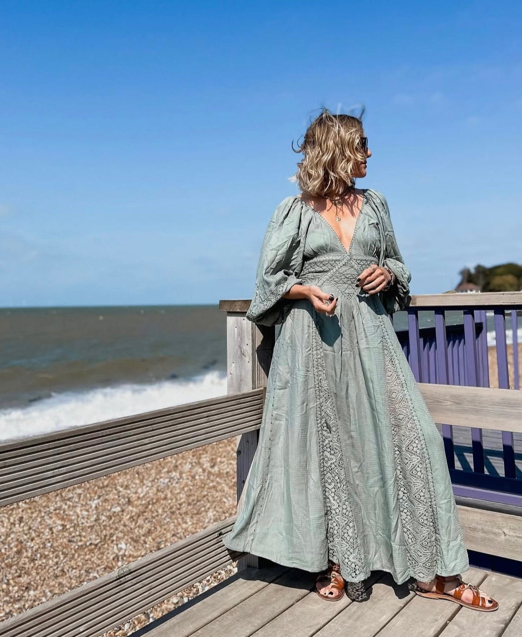 Green long sleeved maxi dress with crochet lace panels on skirt and sleeves