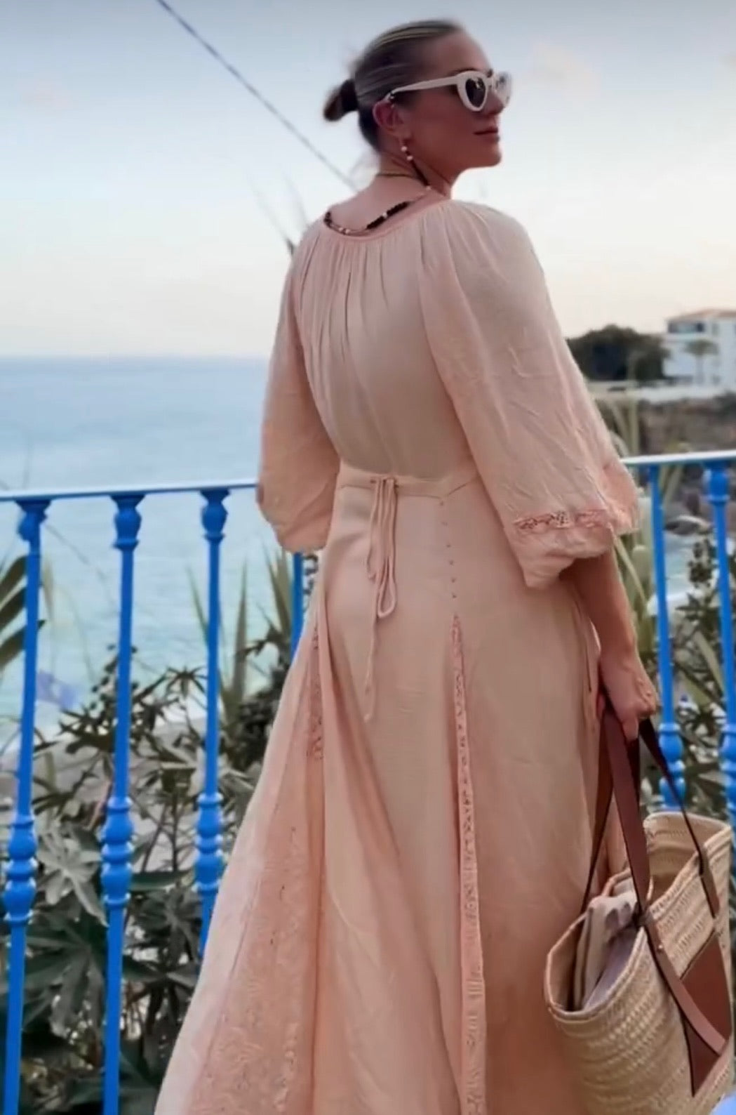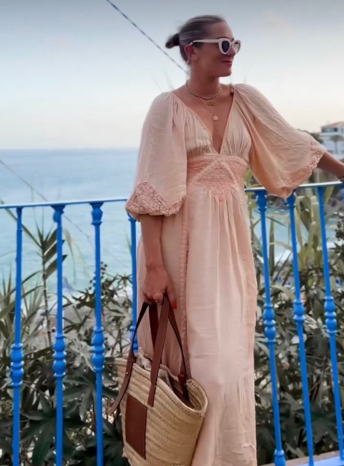 Peach maxi dress with crochet lace panels on skirt and sleeves