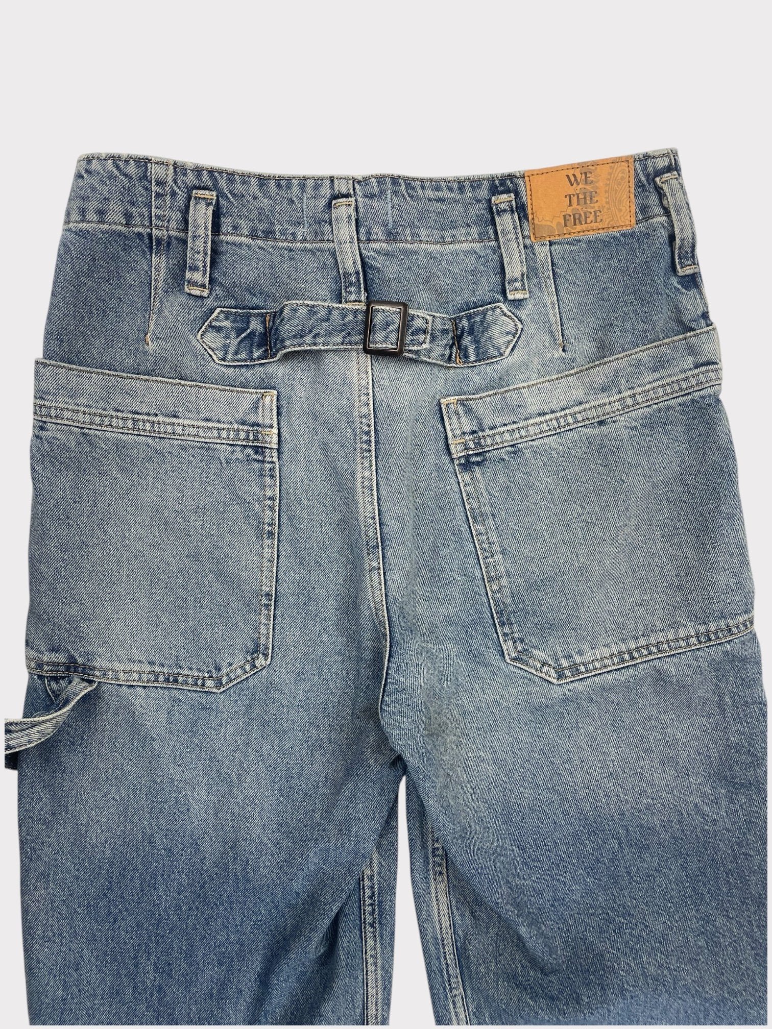 Mid-blue wide leg jeans with side strap and buckle detail at back