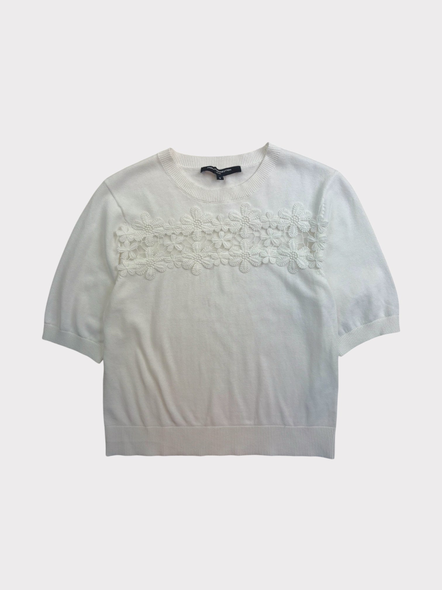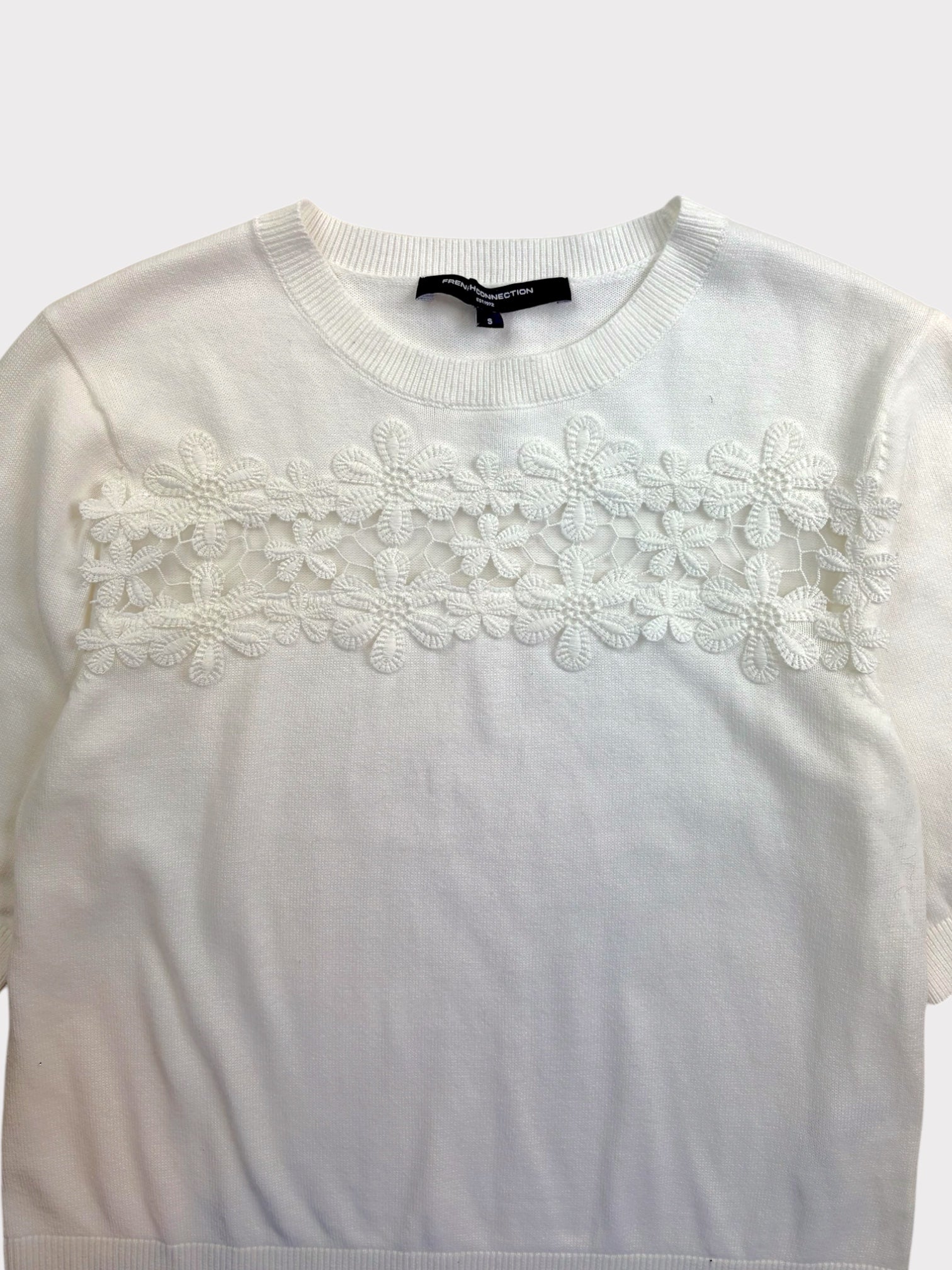 White knitted short sleeved top with mesh panel with crochet lace detail across chest