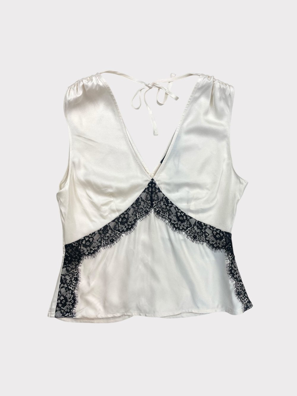 Cream satin sleeveless v-neck top with contrasting black eyelash lace detail