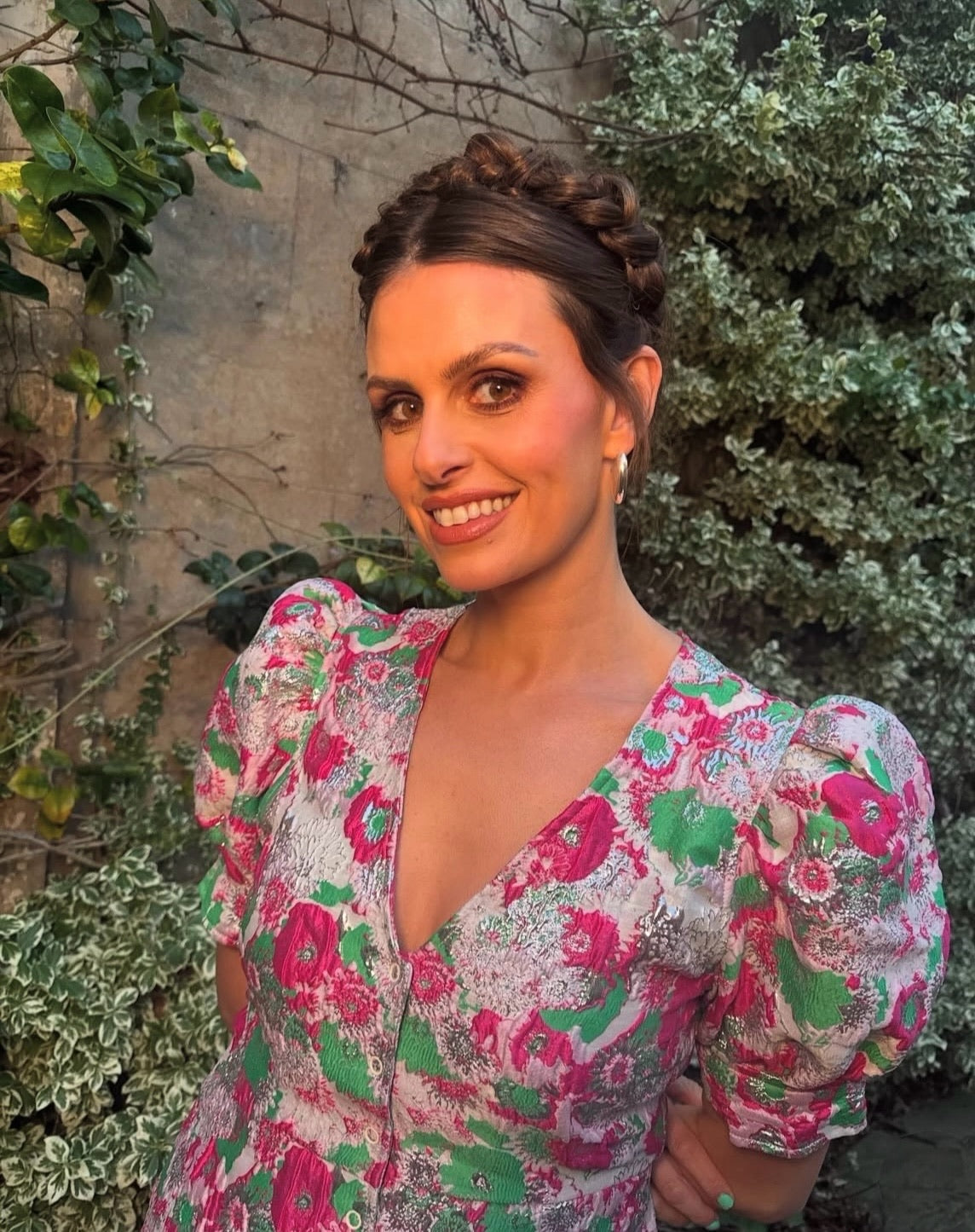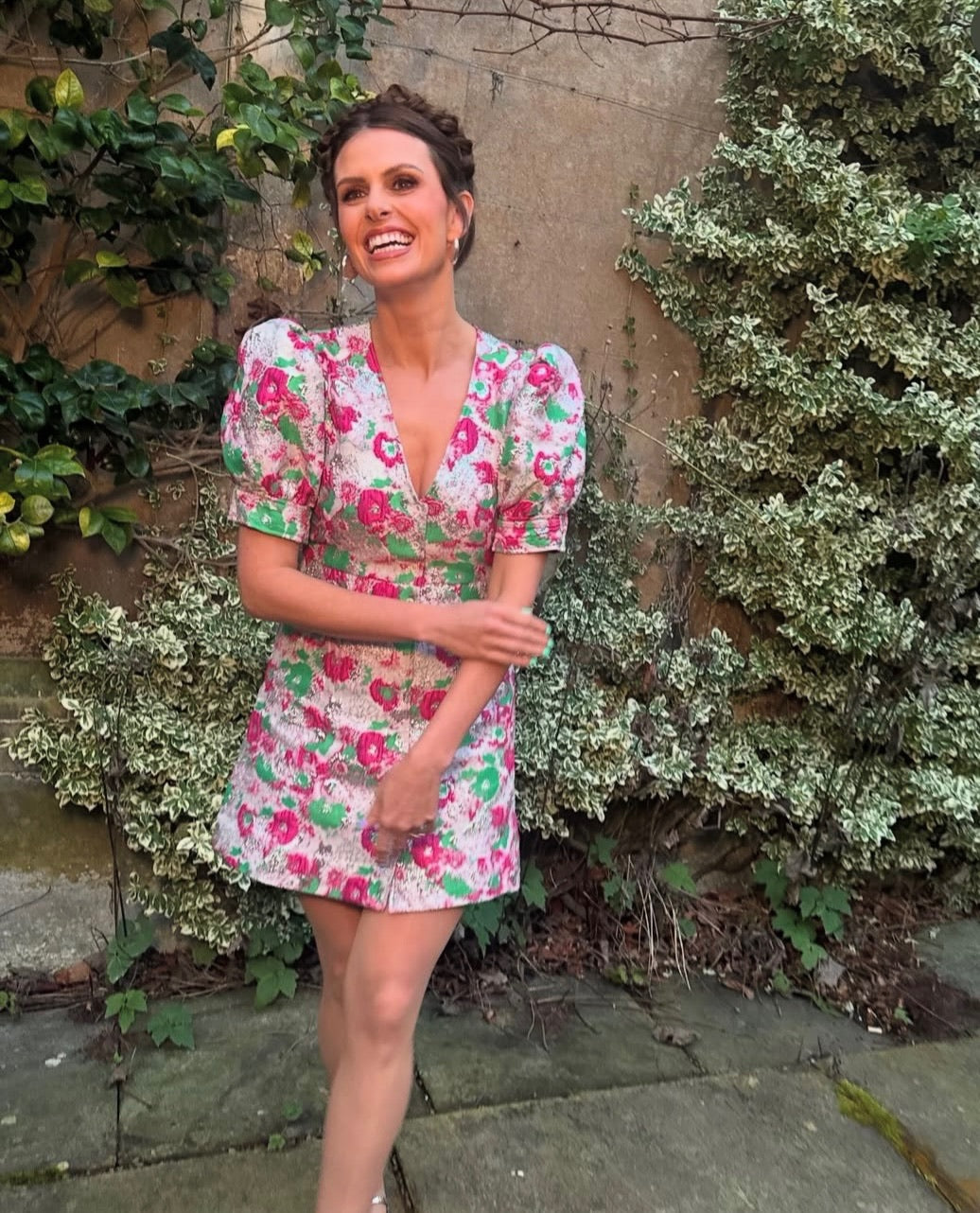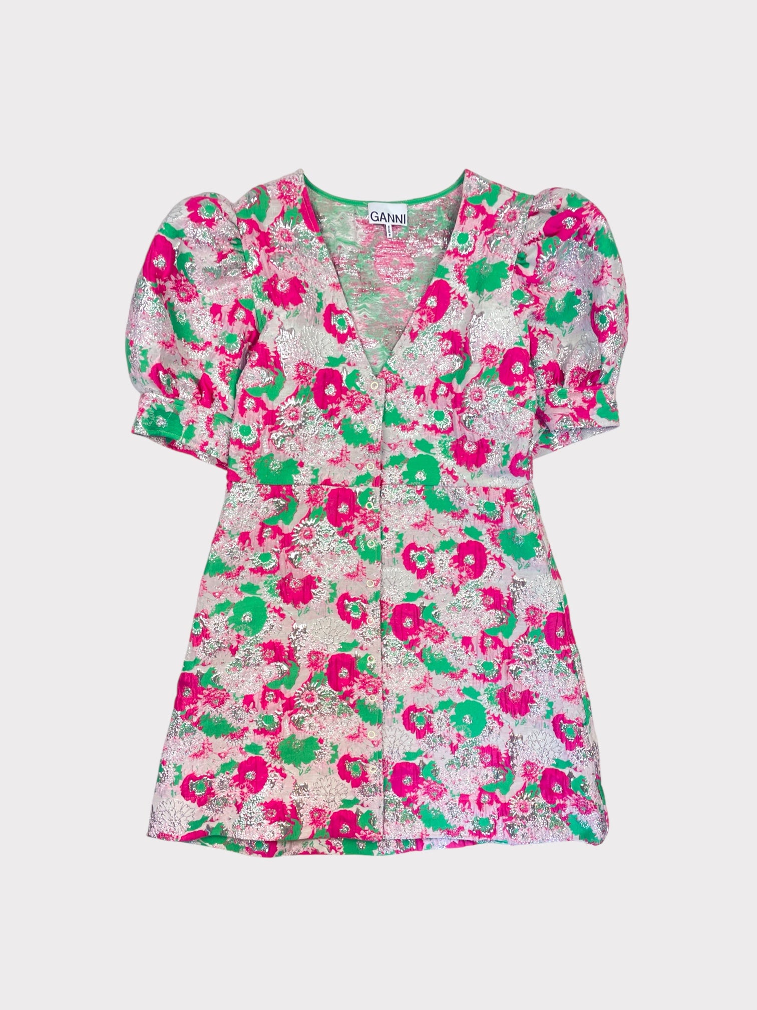 Pink, green and metallic silver brocade mini dress with puff sleeves