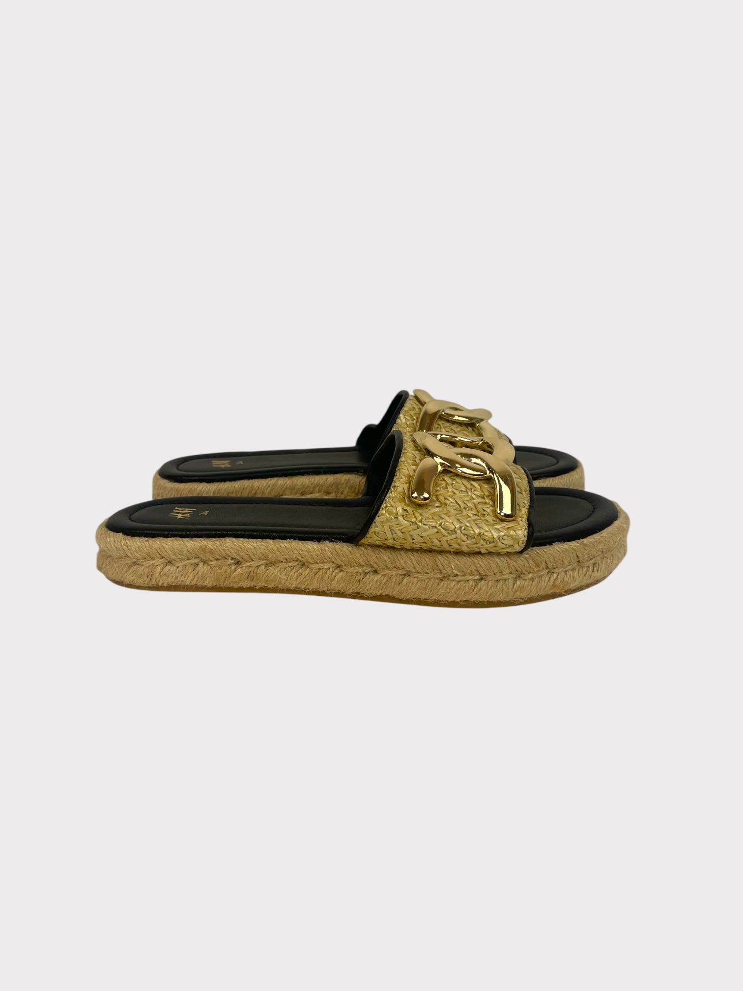 Raffia slide sandals with espadrille sole and large gold buckle detail