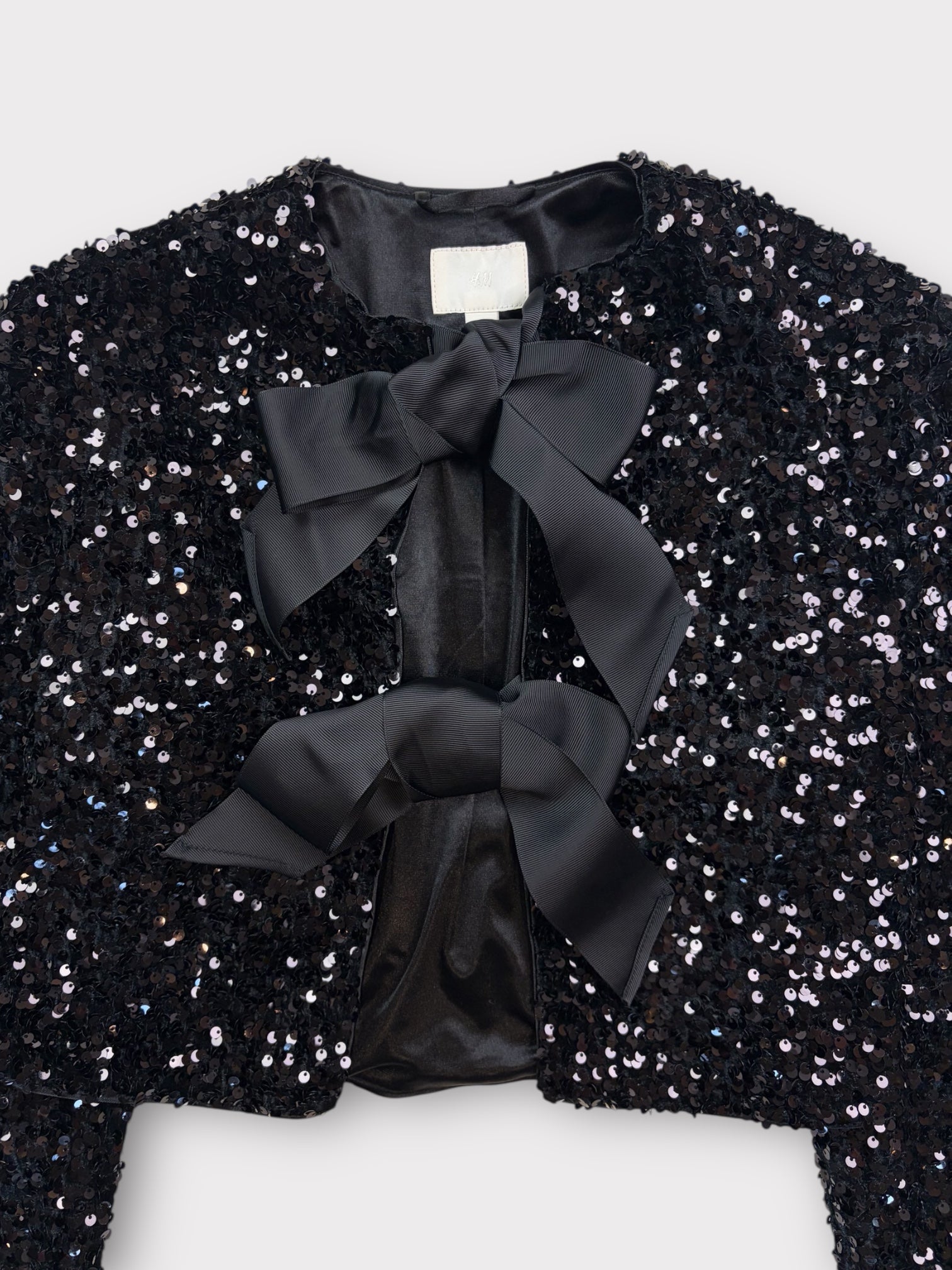 Black sequin boxy fit jacket with double grosgrain ribbon fastening