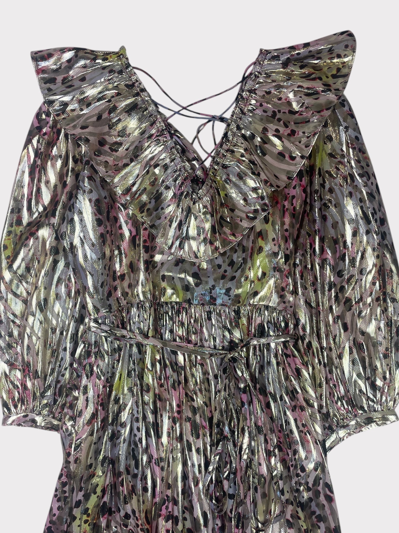 Pink and metallic gold animal print maxi dress with frilled collar