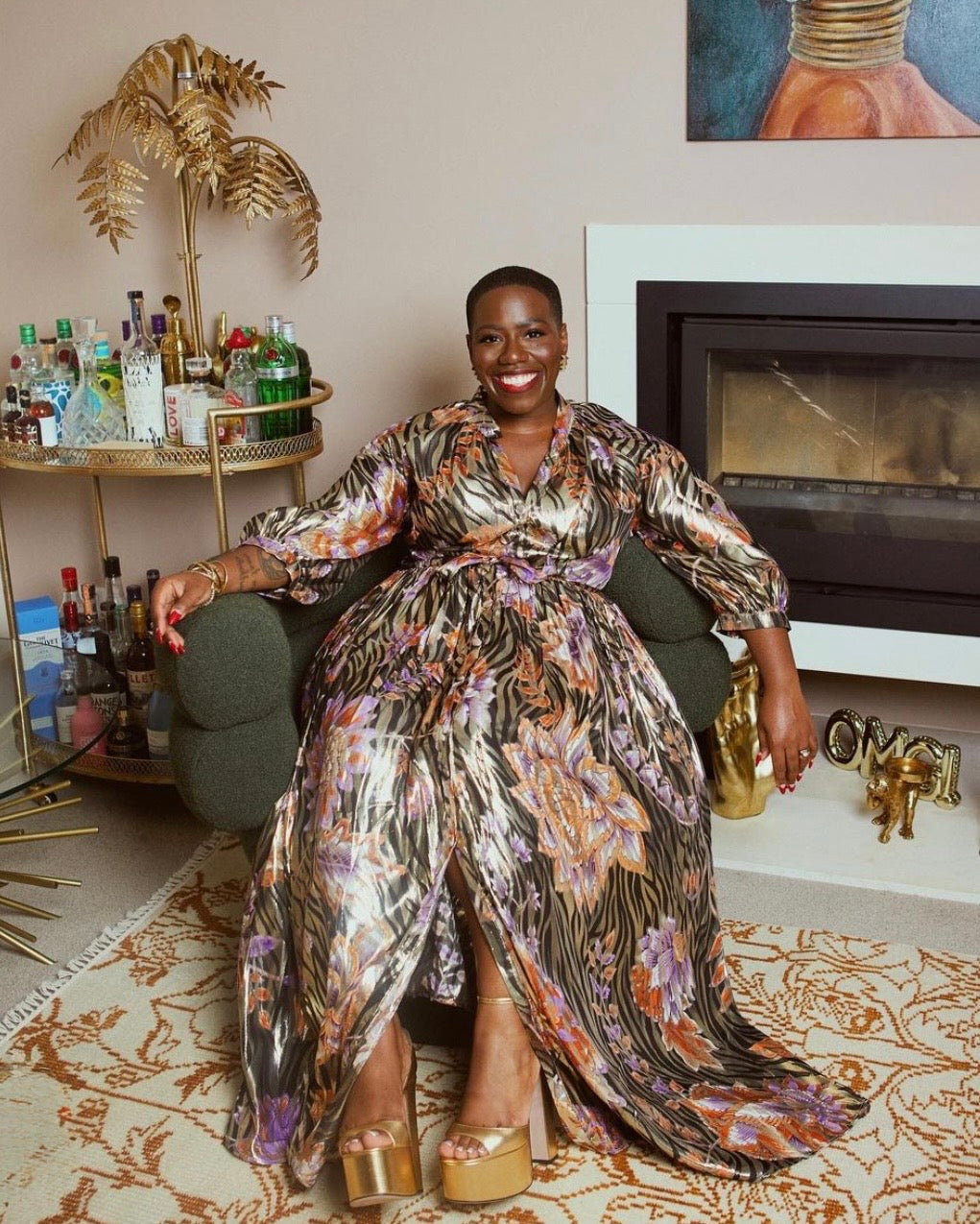 Metallic gold and floral print silk blend button up maxi dress