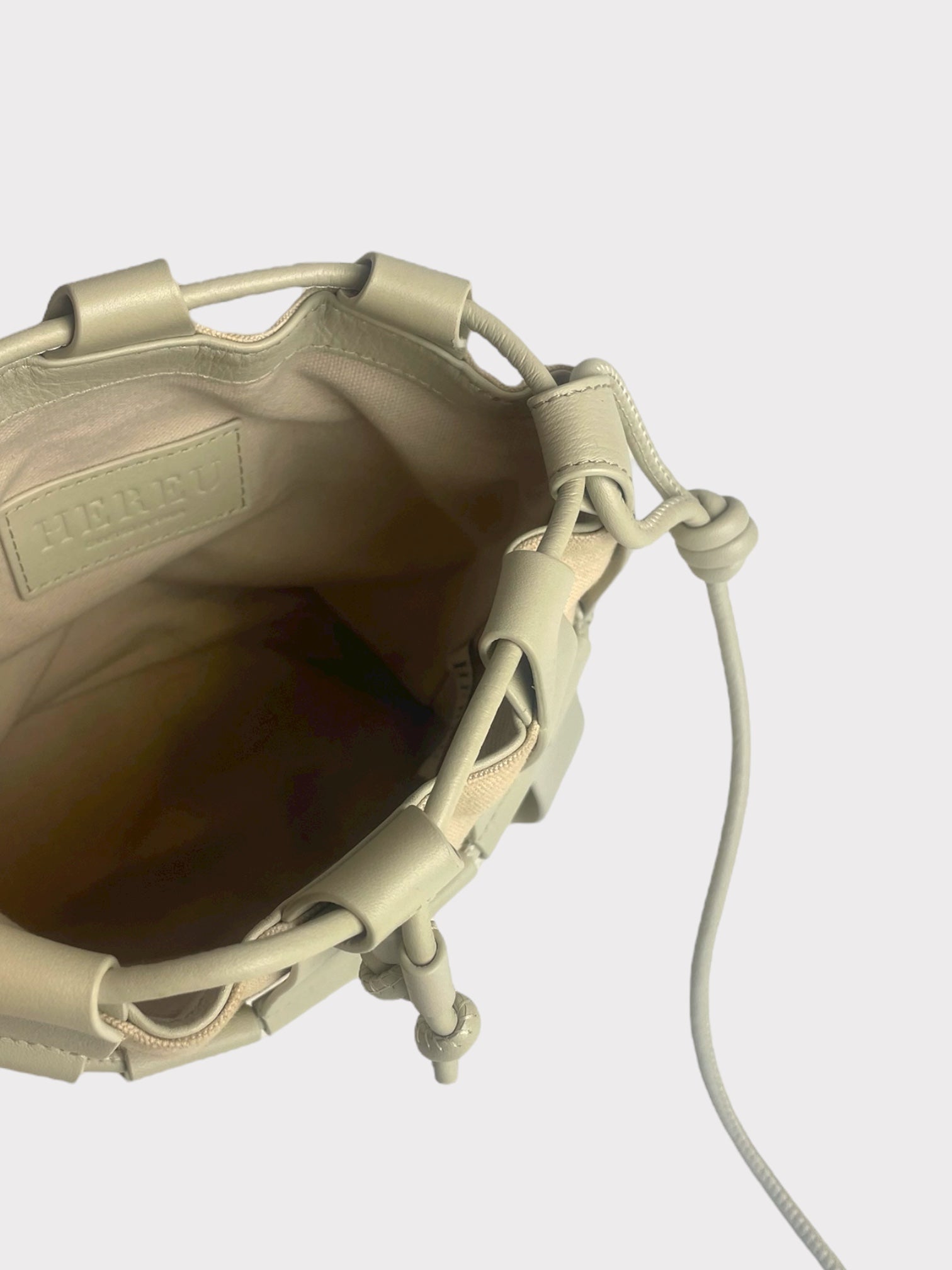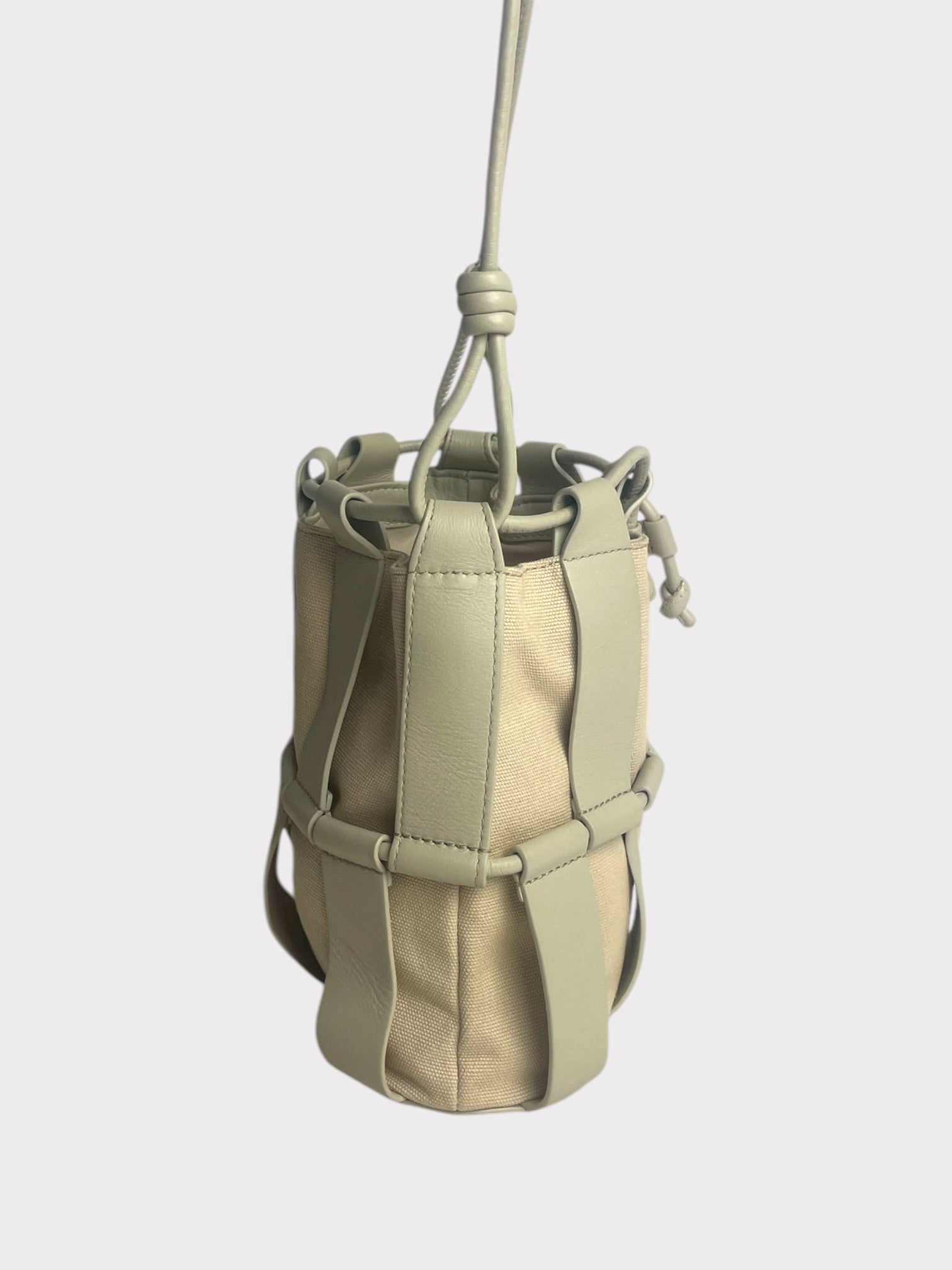 Cream mini bucket bag in canvas with over-layed leather stripes