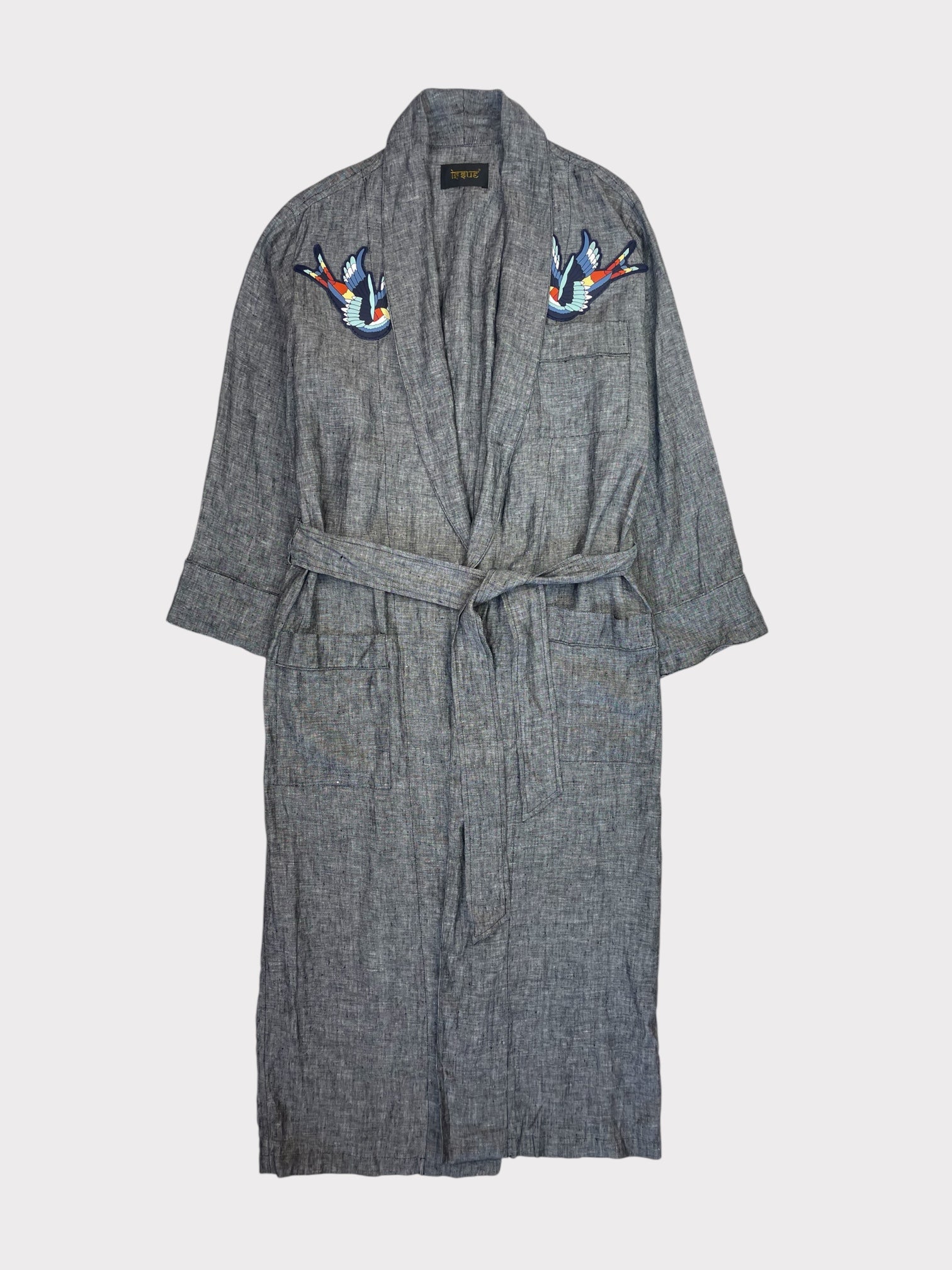 Grey marled chambray full length belted jacket with pockets and appliqué swallows