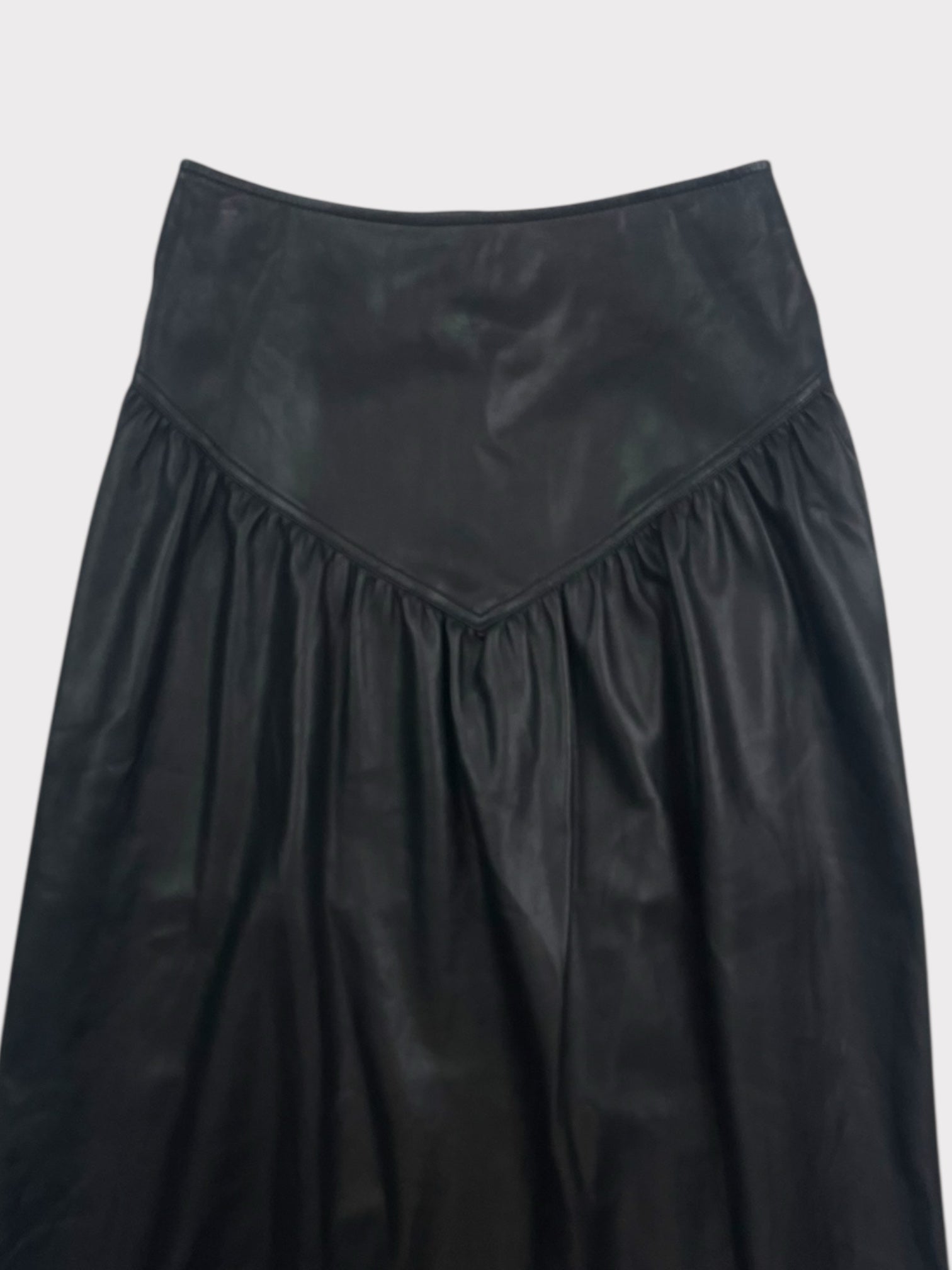 Black faux leather midi skirt with wide yoke and gather detail