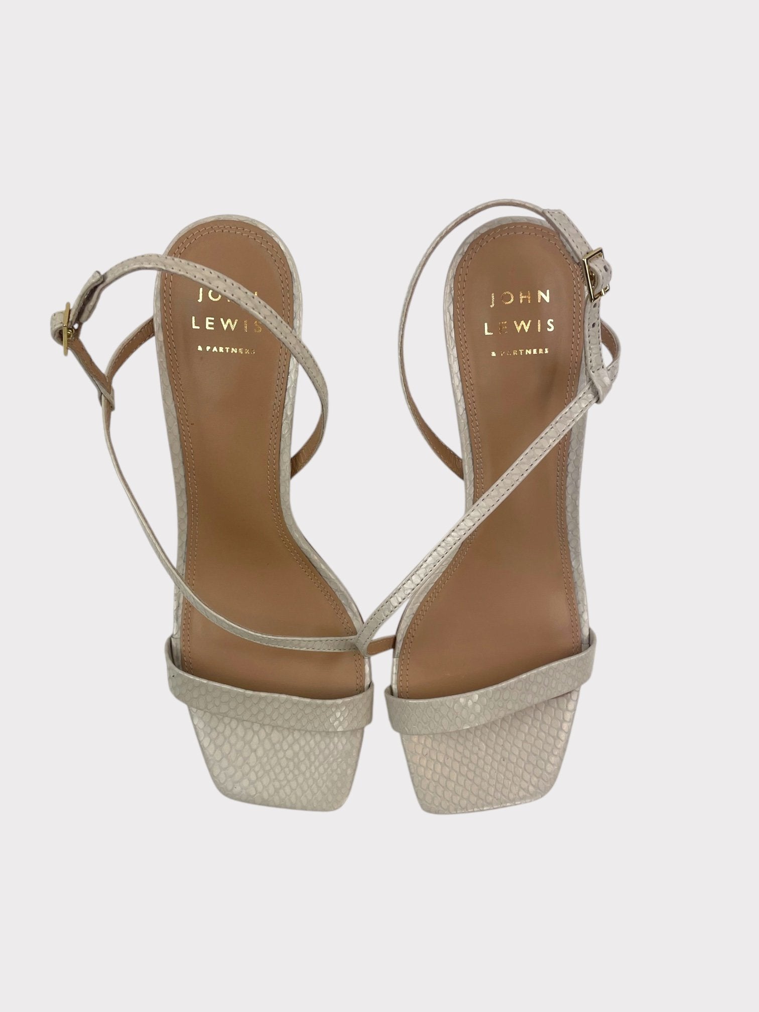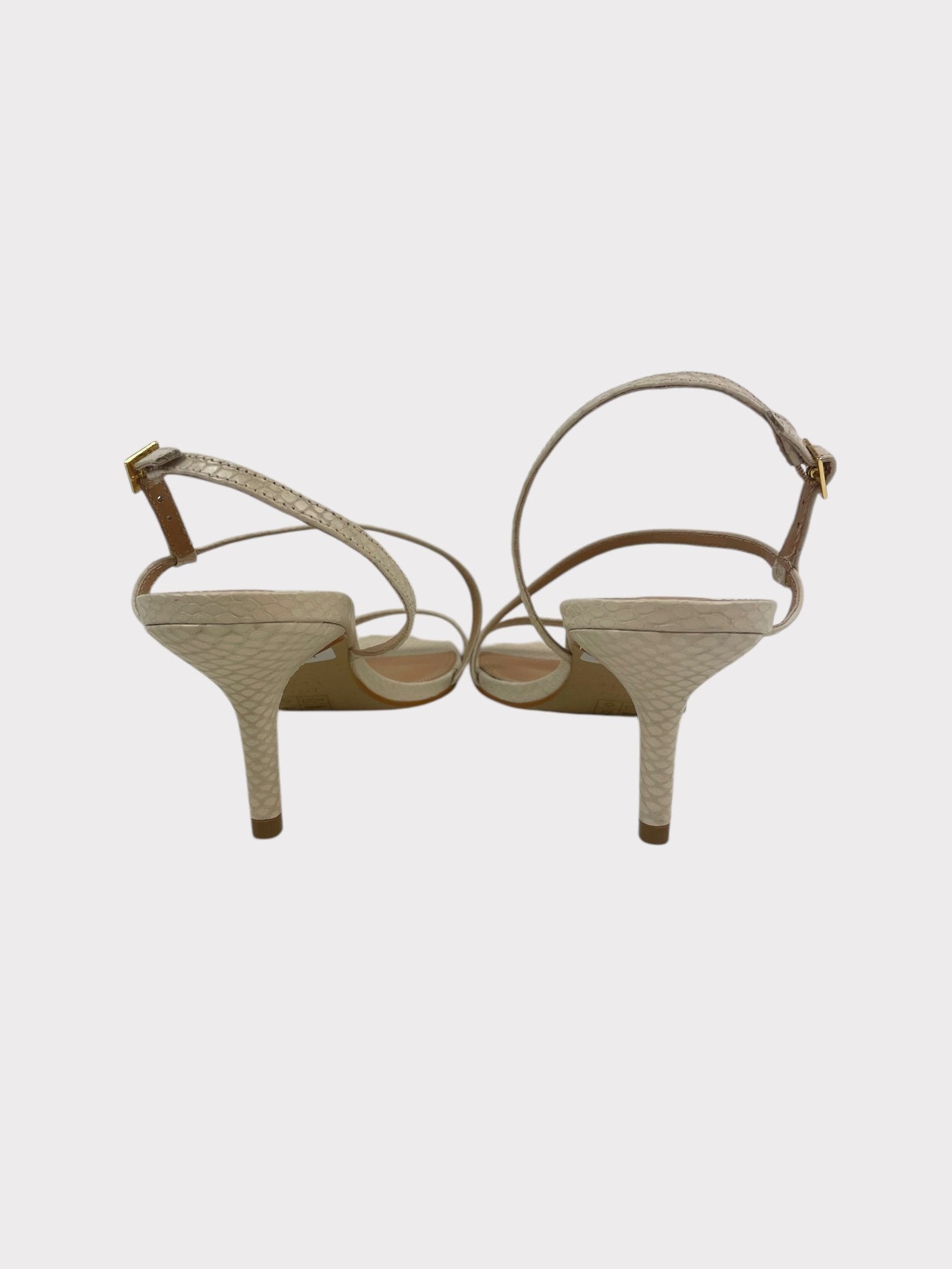 Cream faux snakeskin sandals with narrow straps and kitten heel