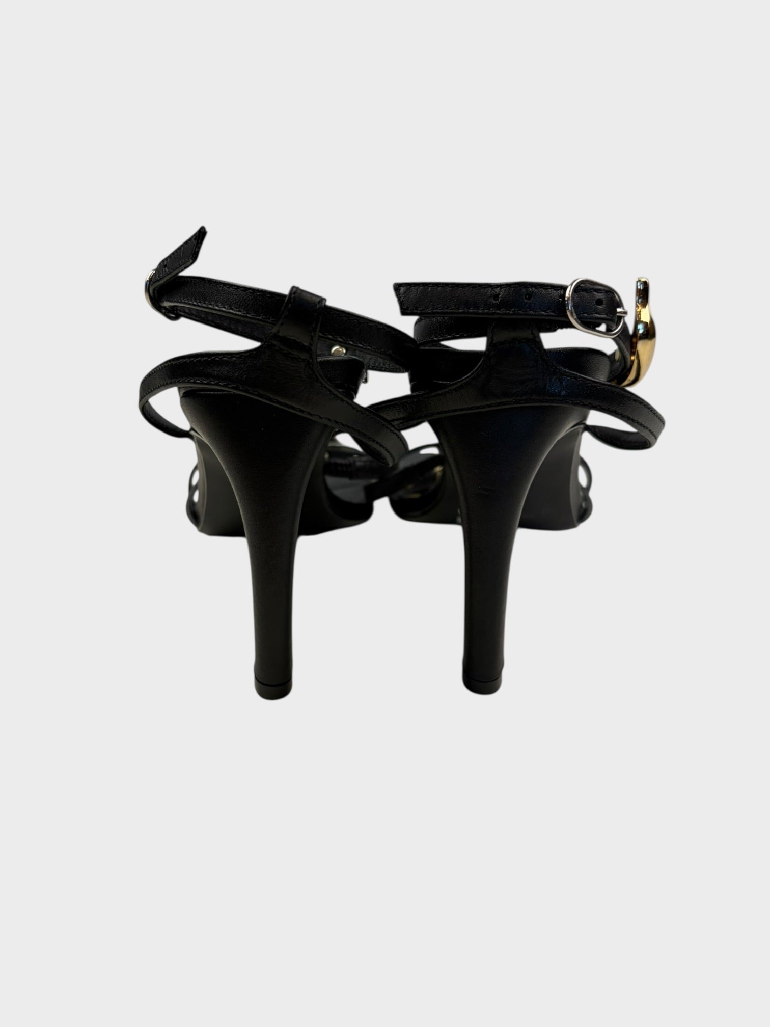 Black strappy sandals with mixed metal banana detail and banana shaped heel
