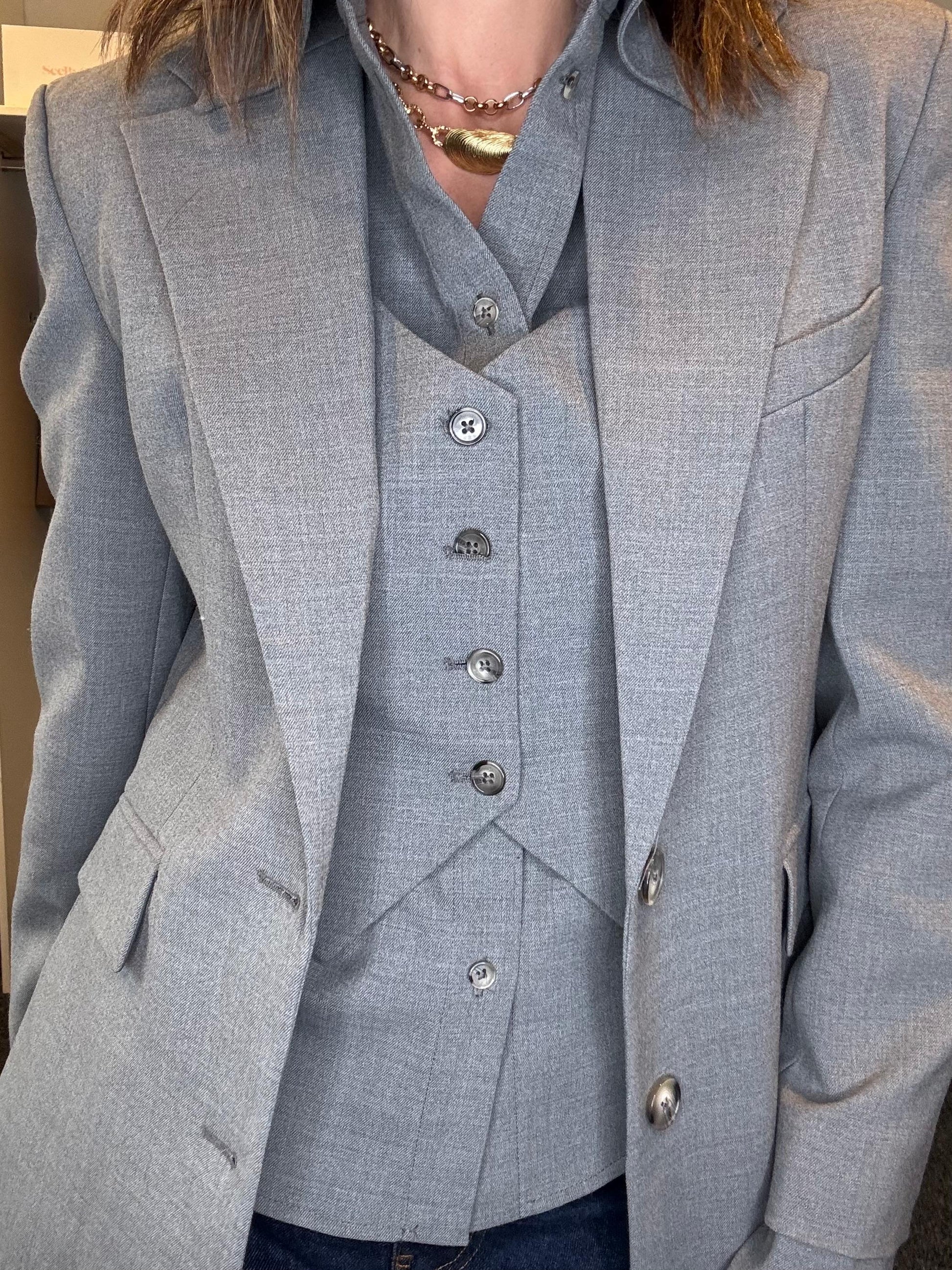 Grey single breasted blazer with built in mock waistcoat and mock shirt detail
