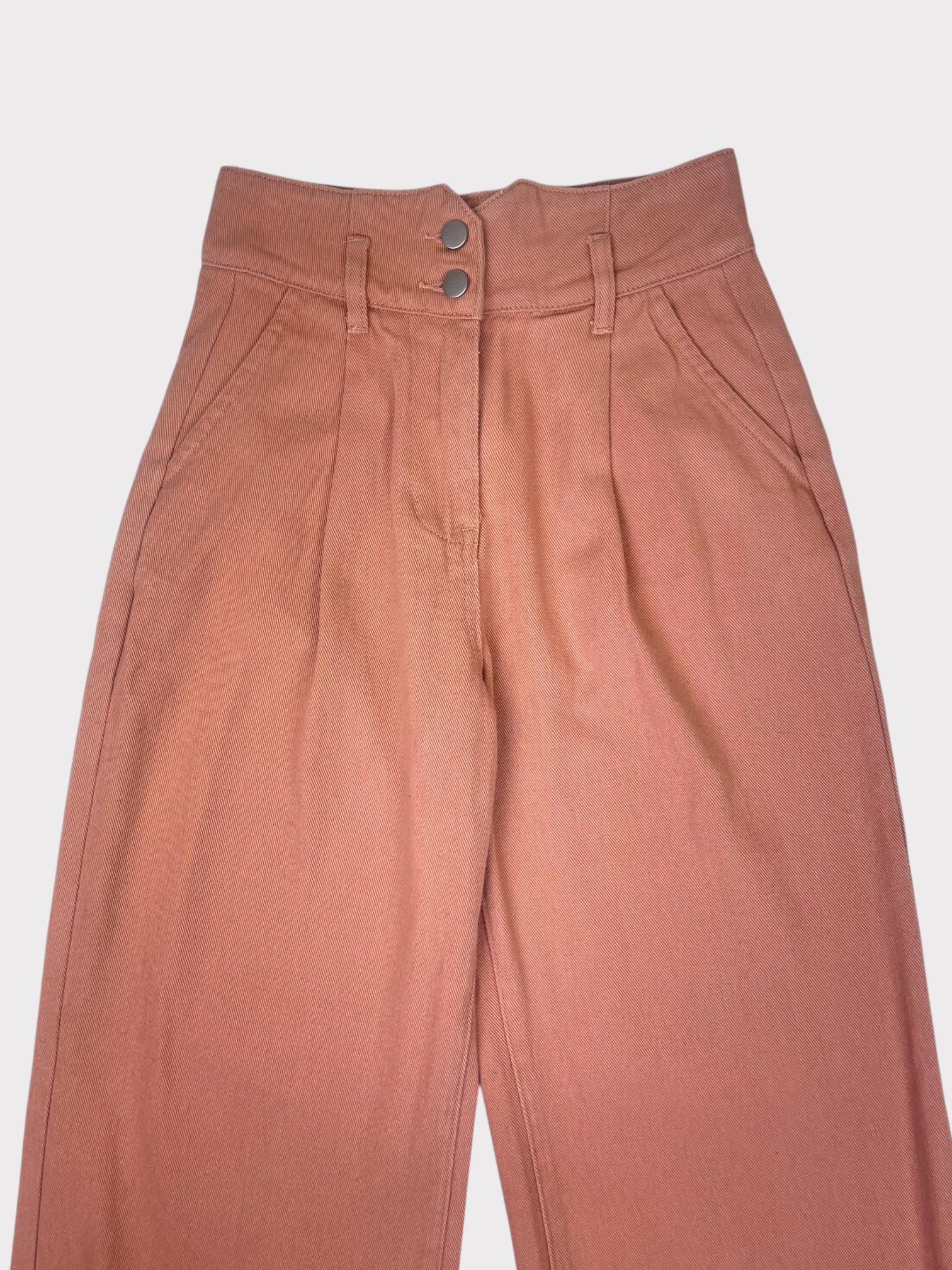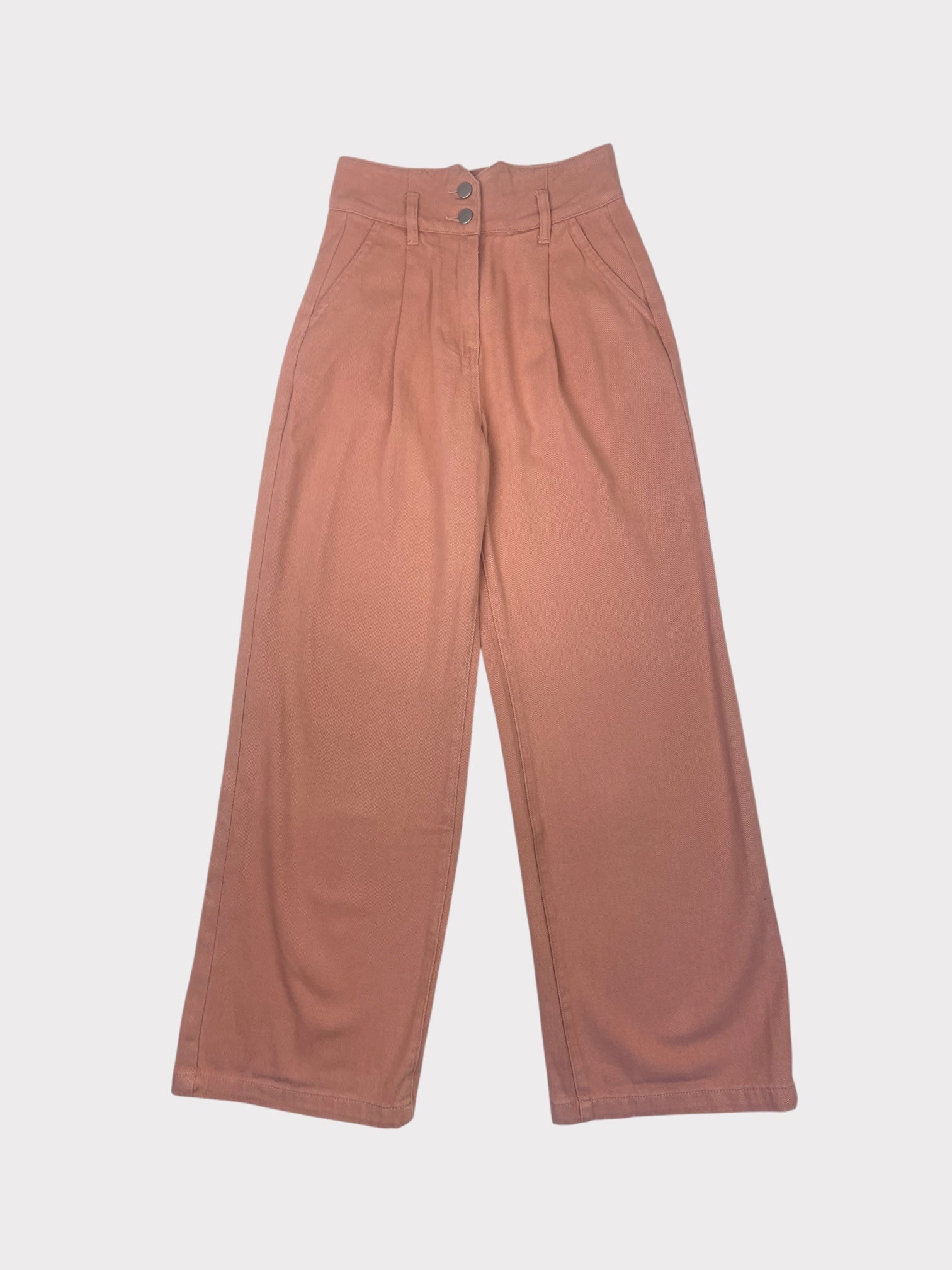 Pink wide leg high waisted jeans with shaped waistband and pleat detail