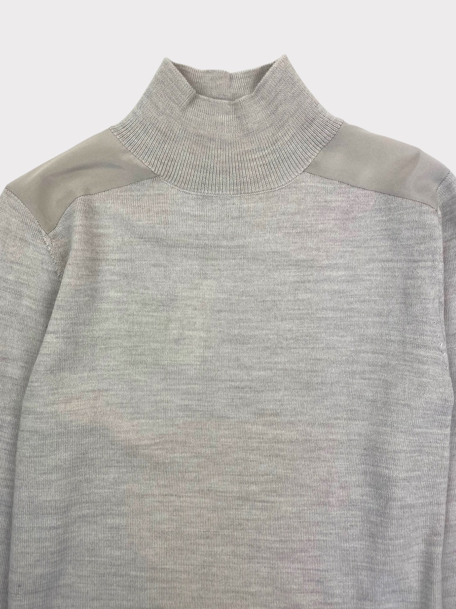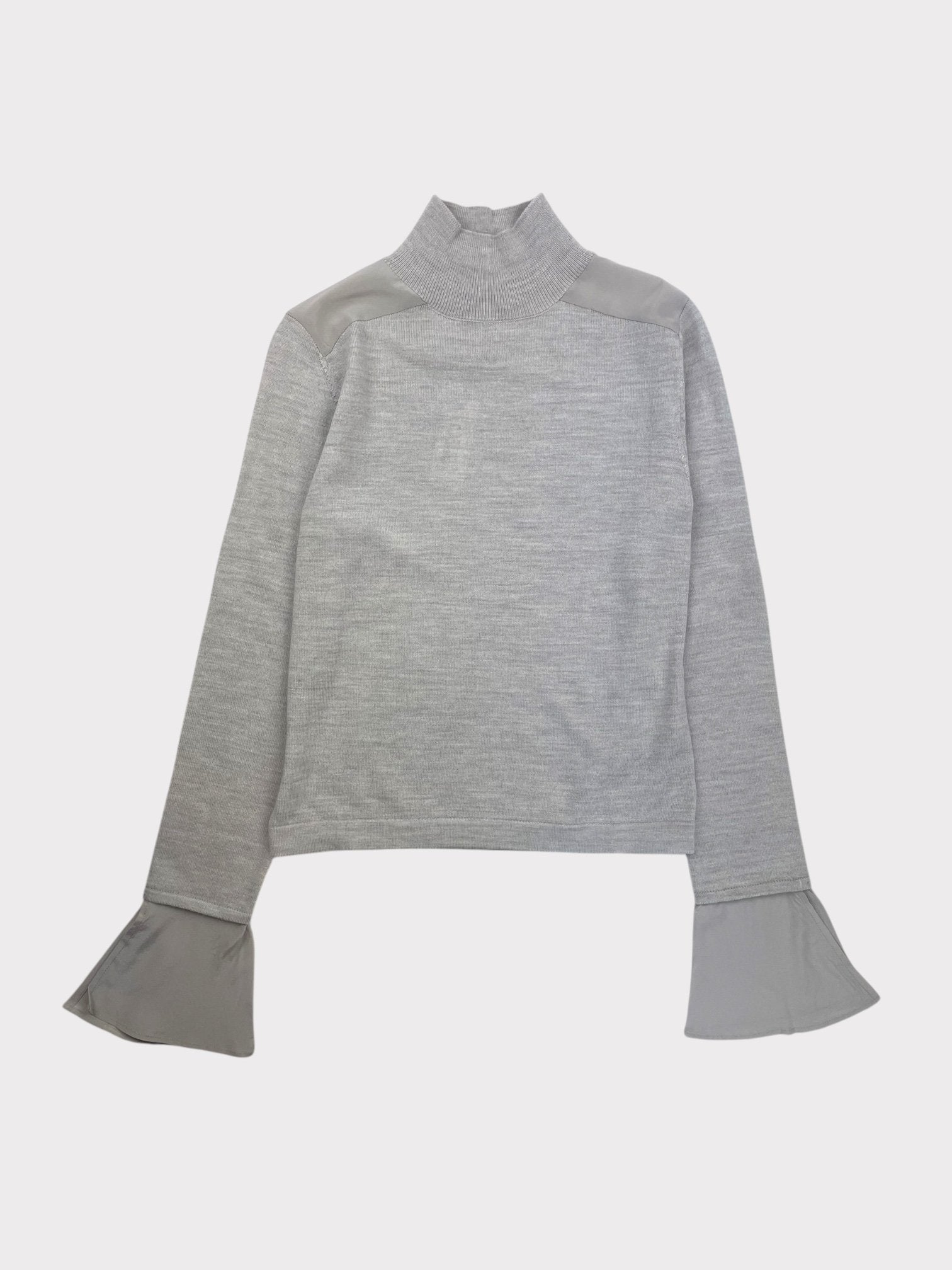Light grey fine knit jumper with contrasting silk flared cuff and shoulder panels
