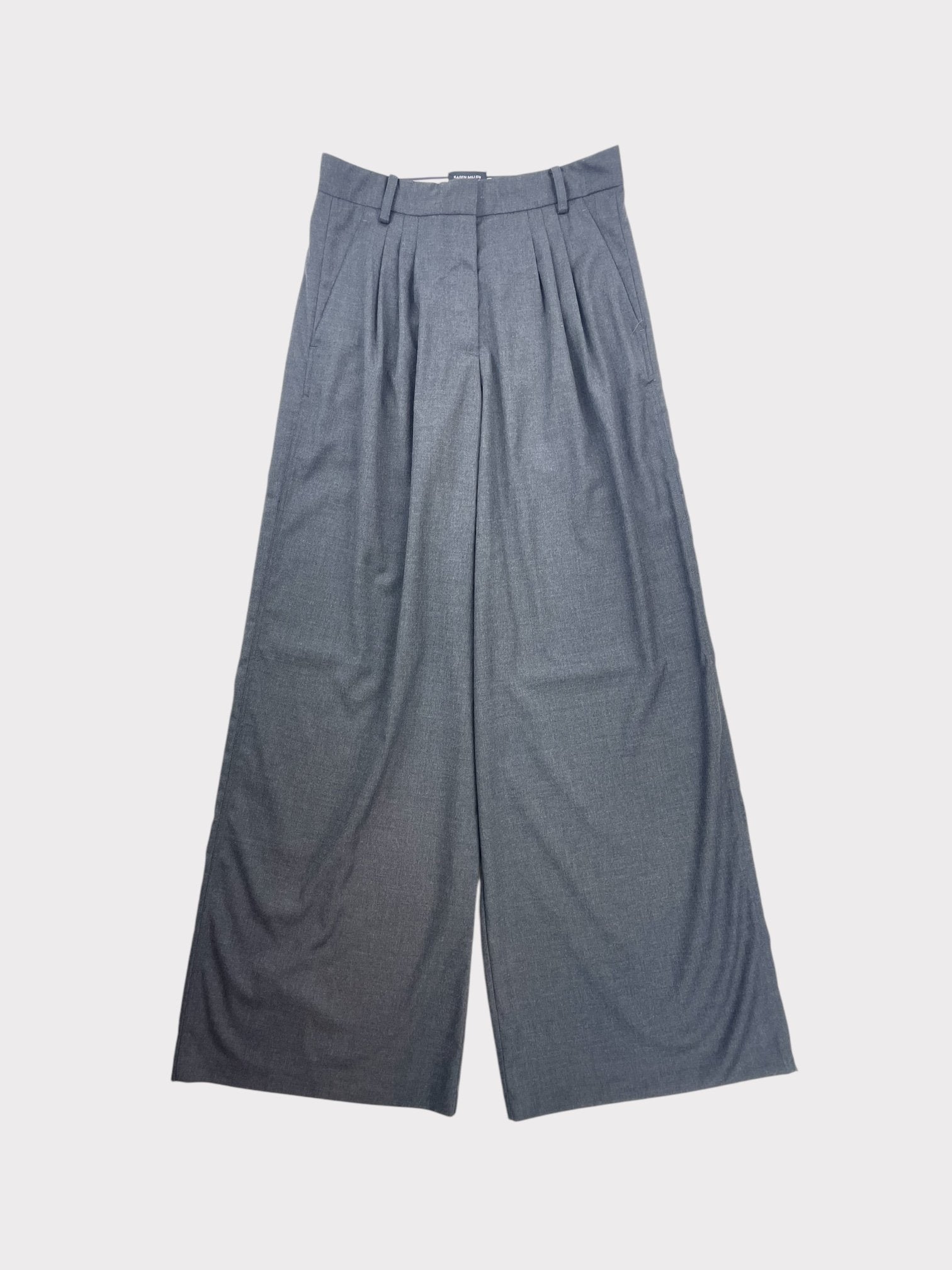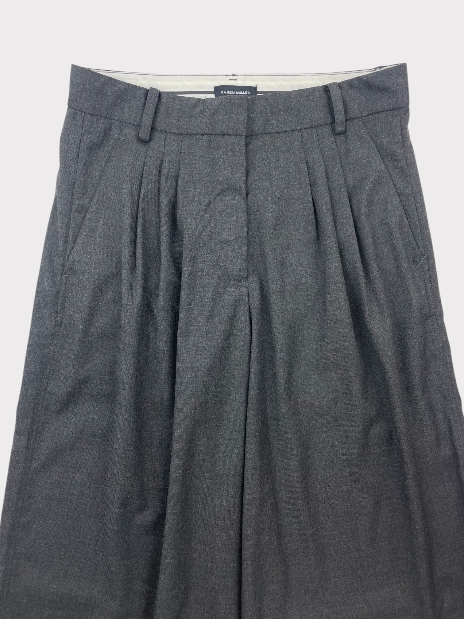 Dark grey wide leg trousers with peat detail at waist