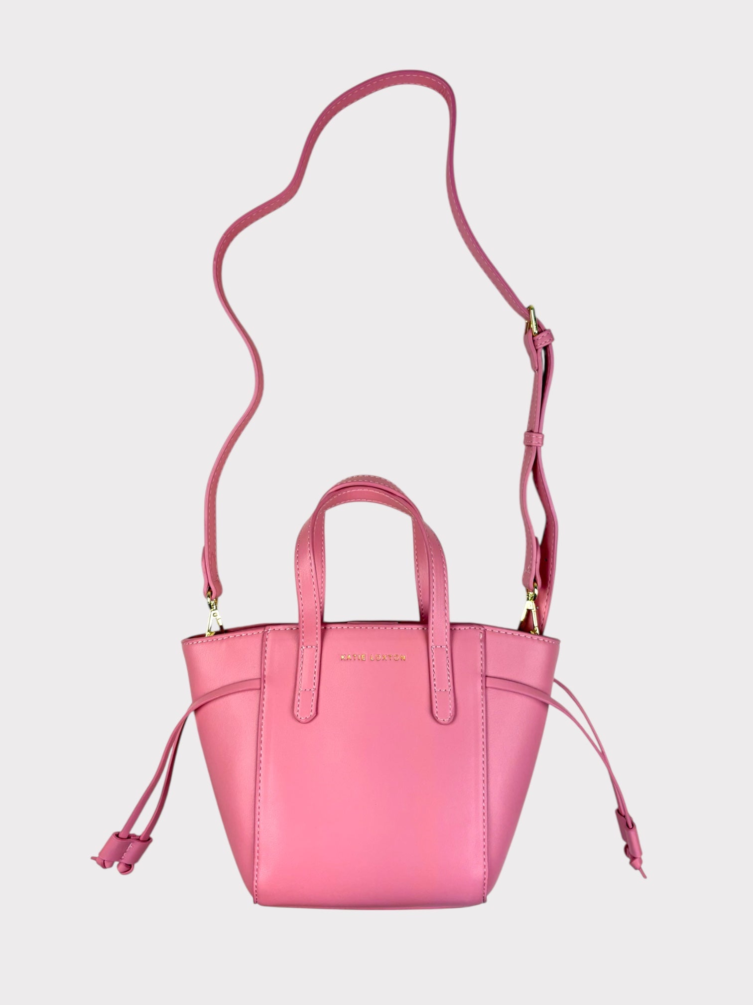 Small pink bag with grab handles and drawstring detail at sides