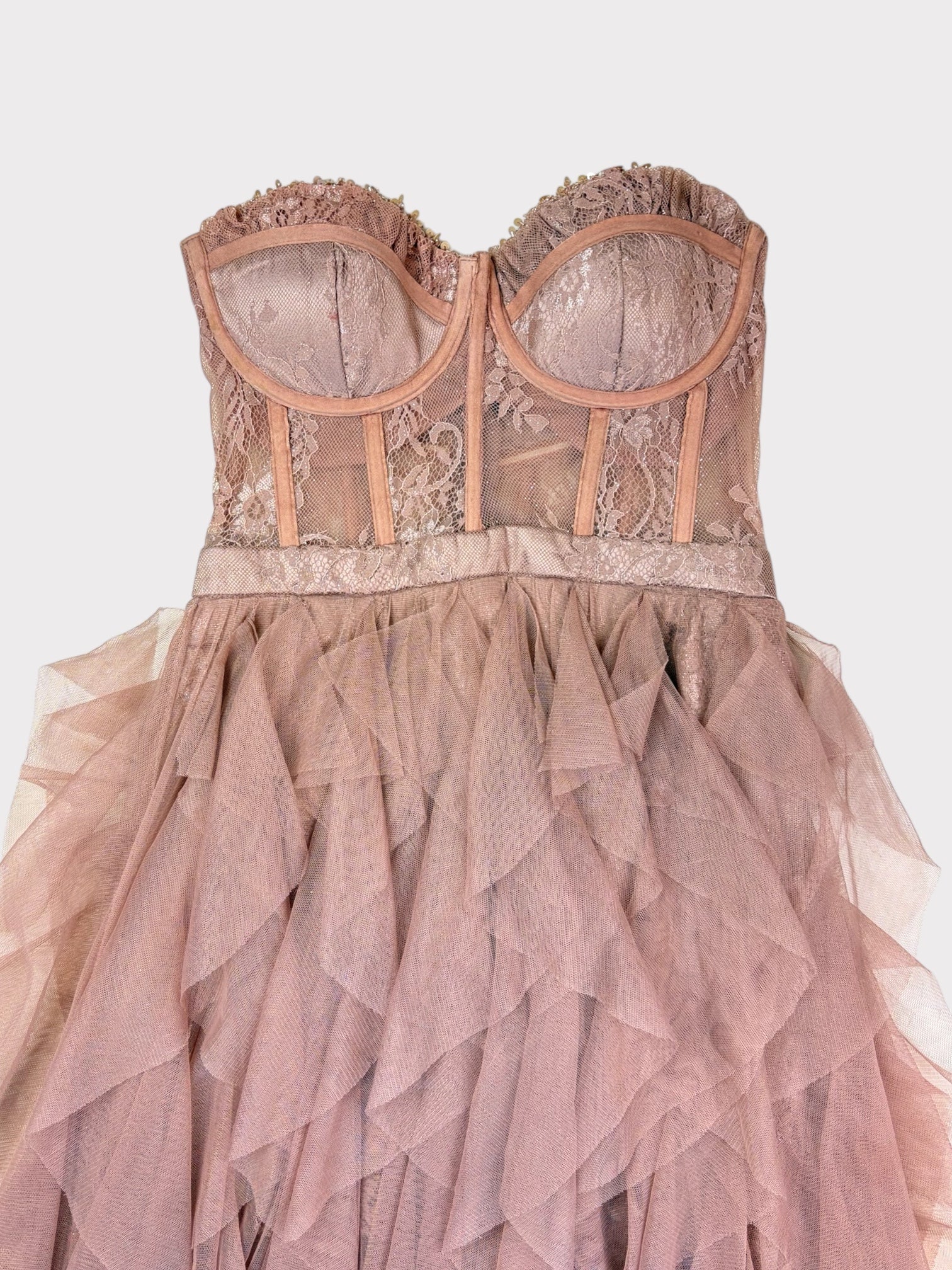 Dusty pink dress with lace corset bodice with padding in cups and layered frilled tulle skirt