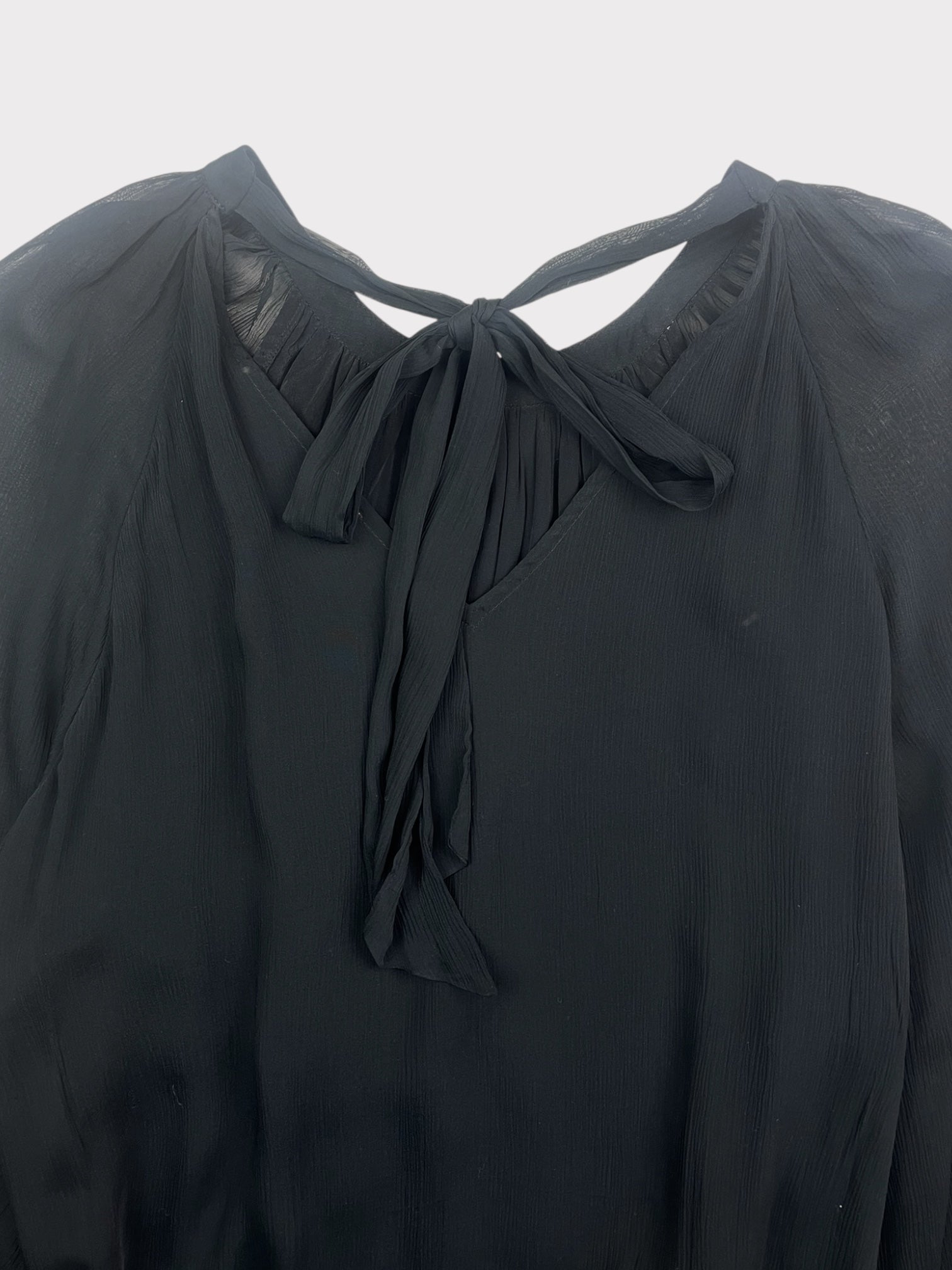 Black semi sheer crinkle fabric long sleeve top with tie detail at back neck