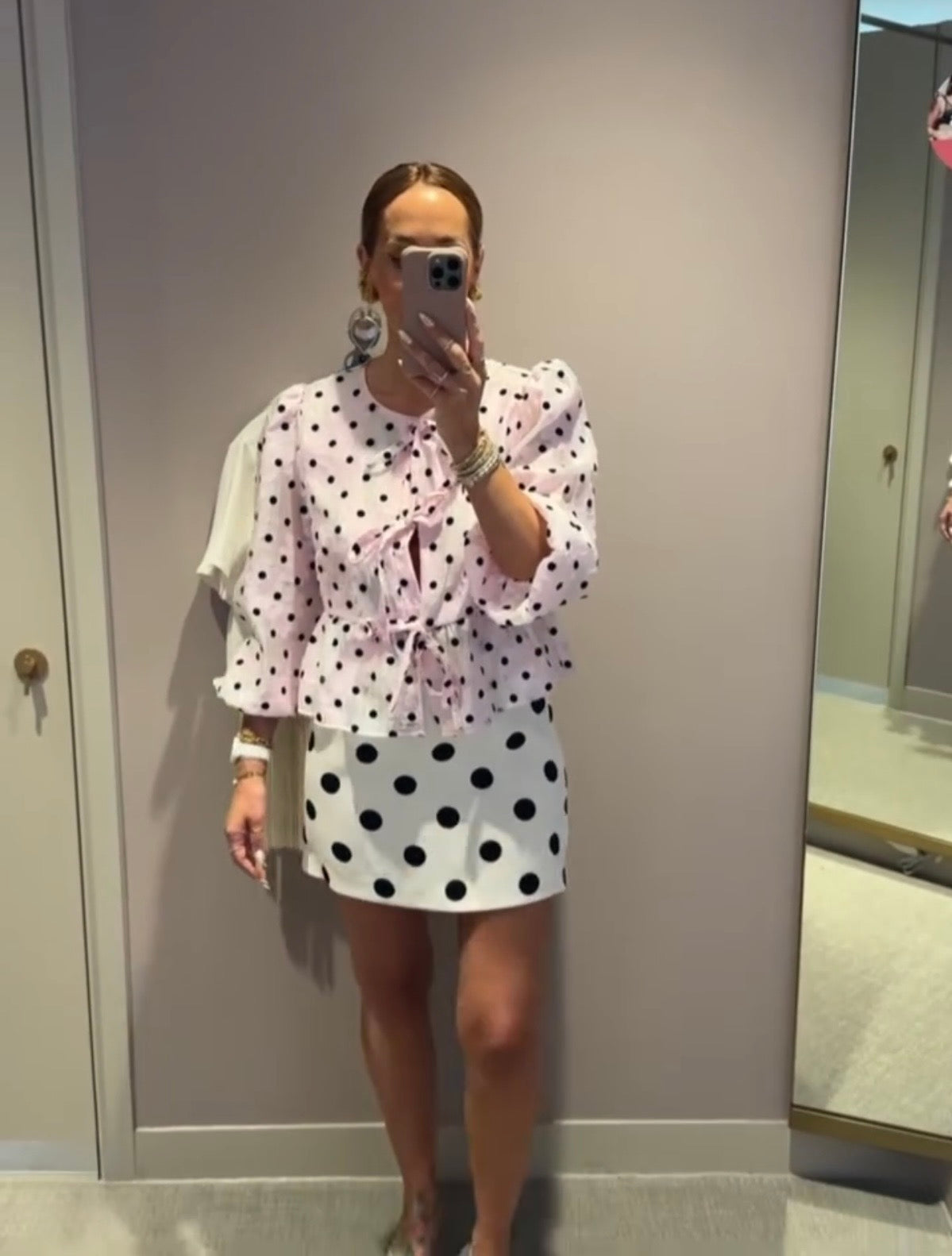 Pale pink organza top textured flower detail and black polka dot print and peplum