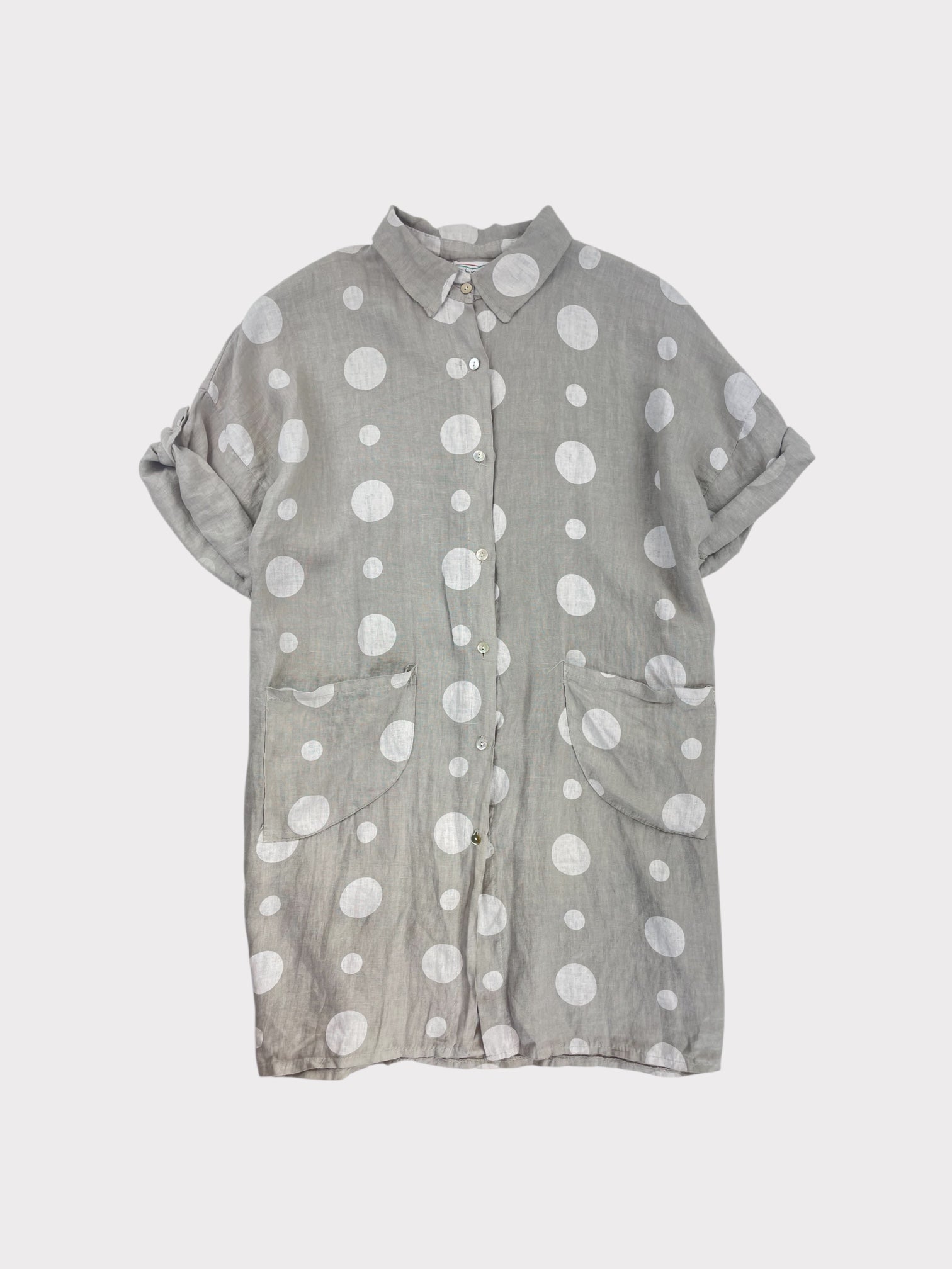 Loose fitting spotty print midi length shirt dress with roll-up short sleeves