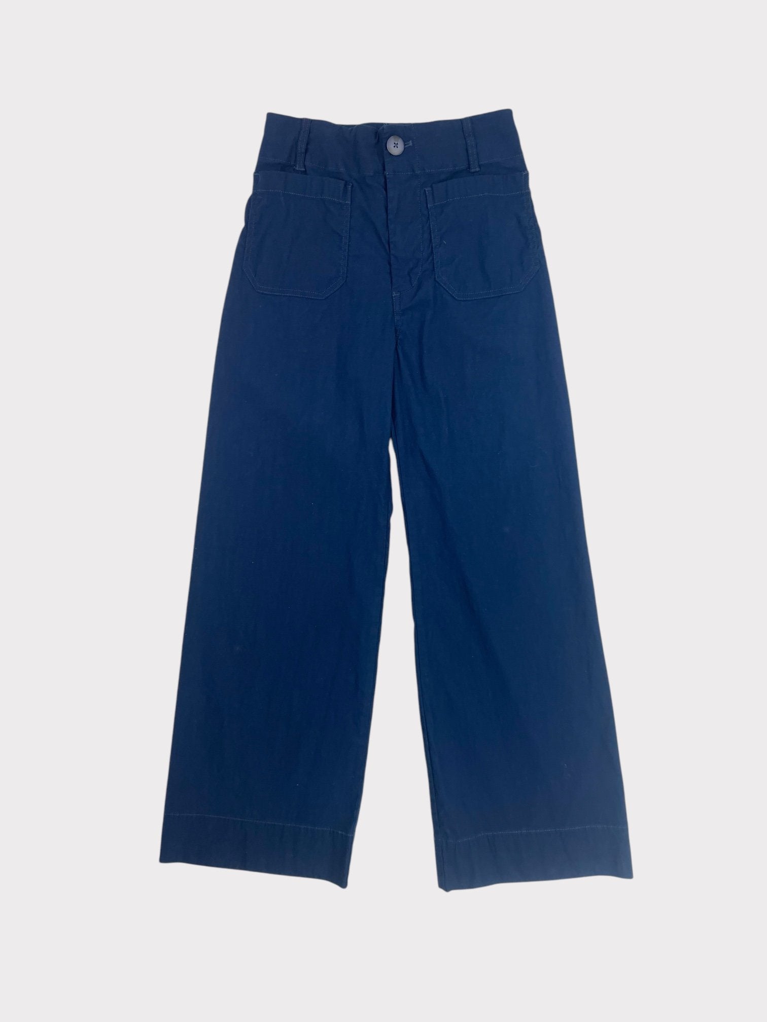 Navy Linen blend wide leg cropped trousers with front pocket detail