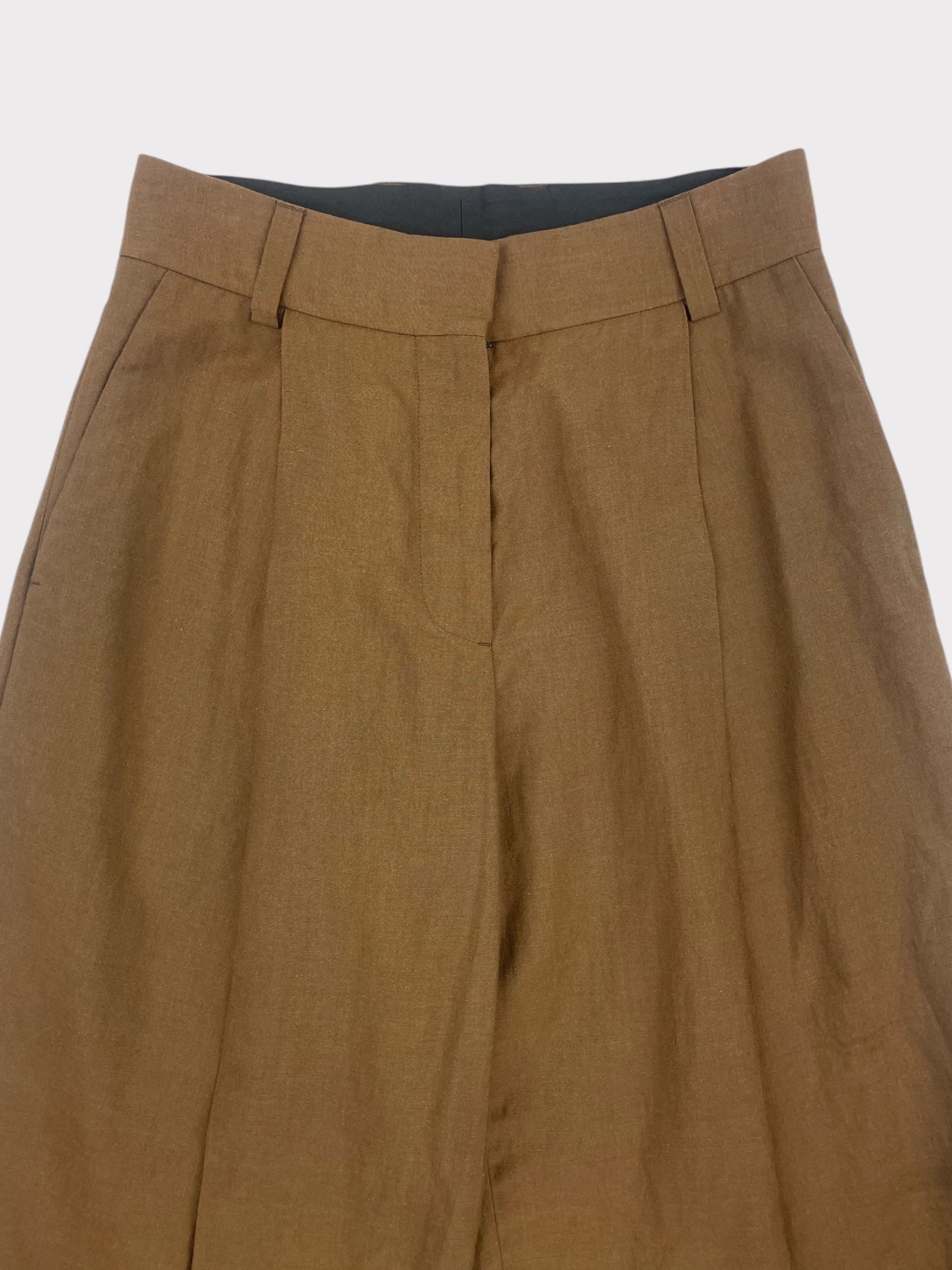 Brown wool and linen blend wide leg trousers and pleat detail down front of leg