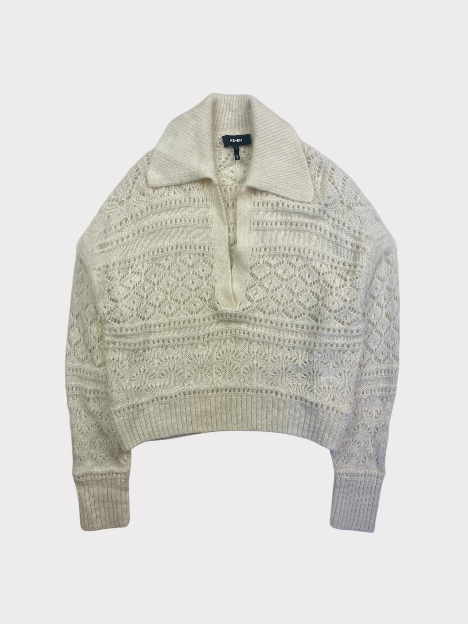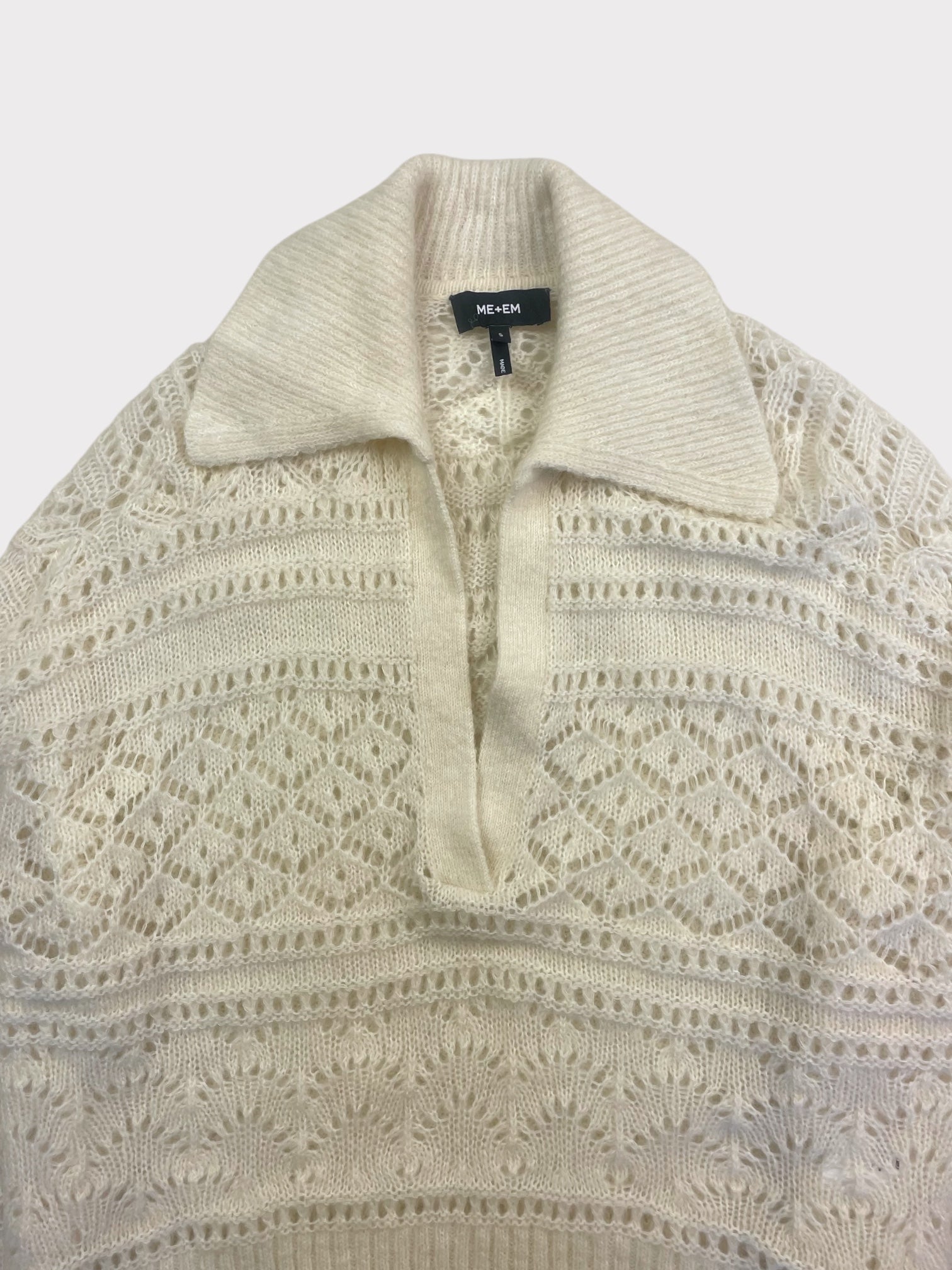 Cream crochet knit wool blend long sleeve jumper with v-neck and rib collar