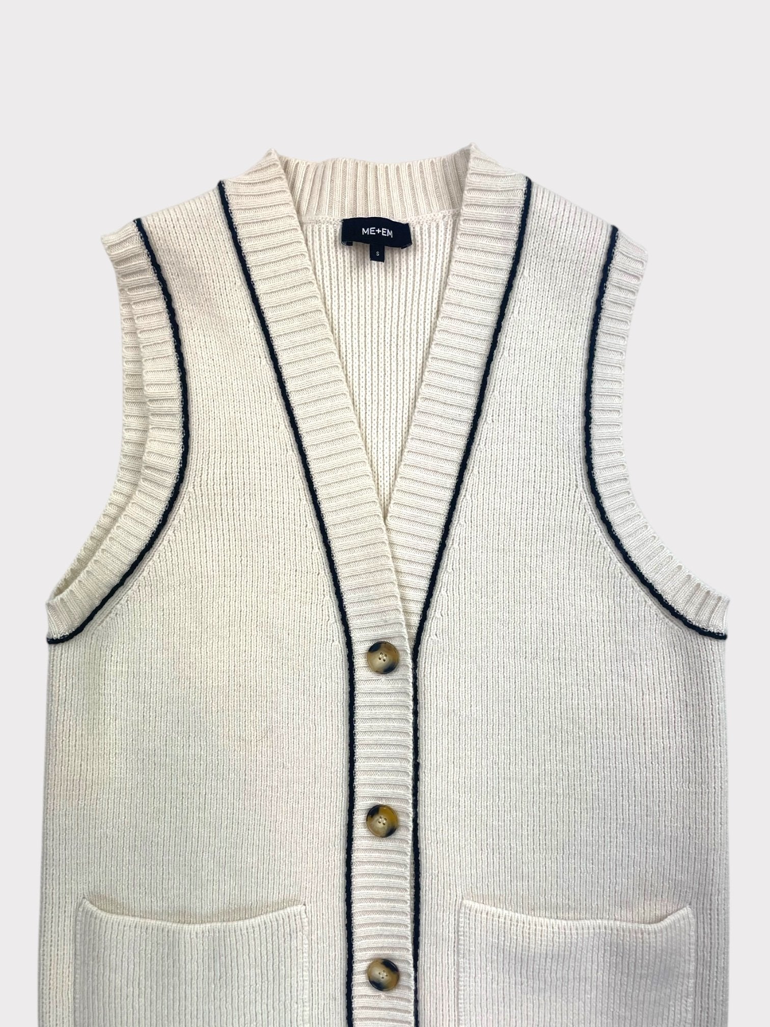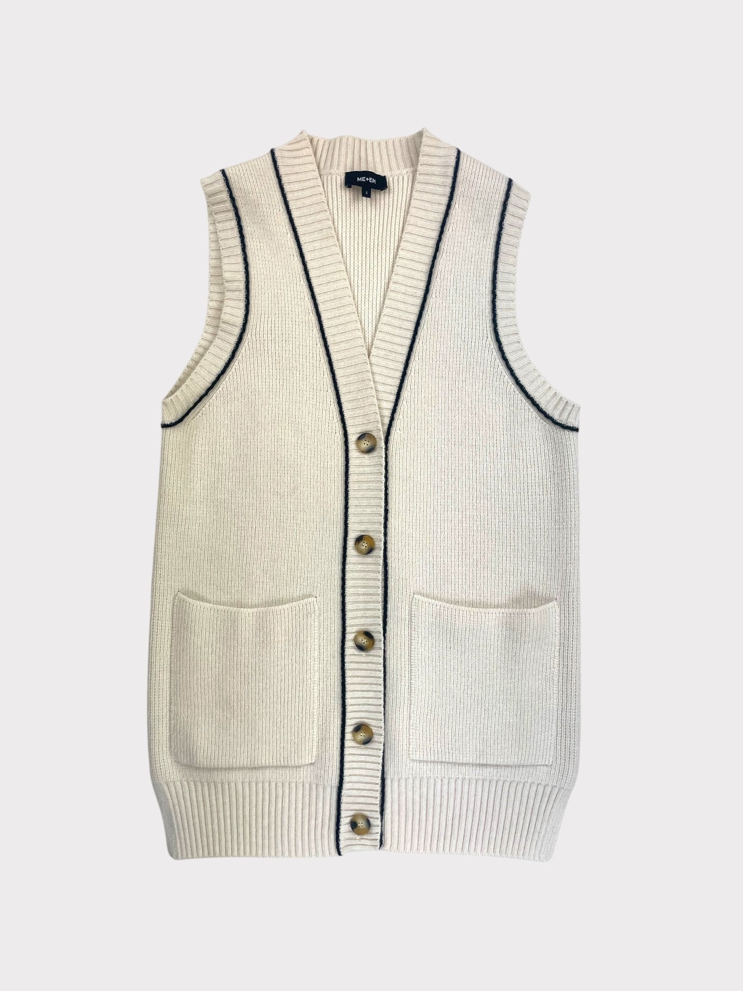 Cream wool/cashmere blend knitted long line waistcoat with contrasting black edging