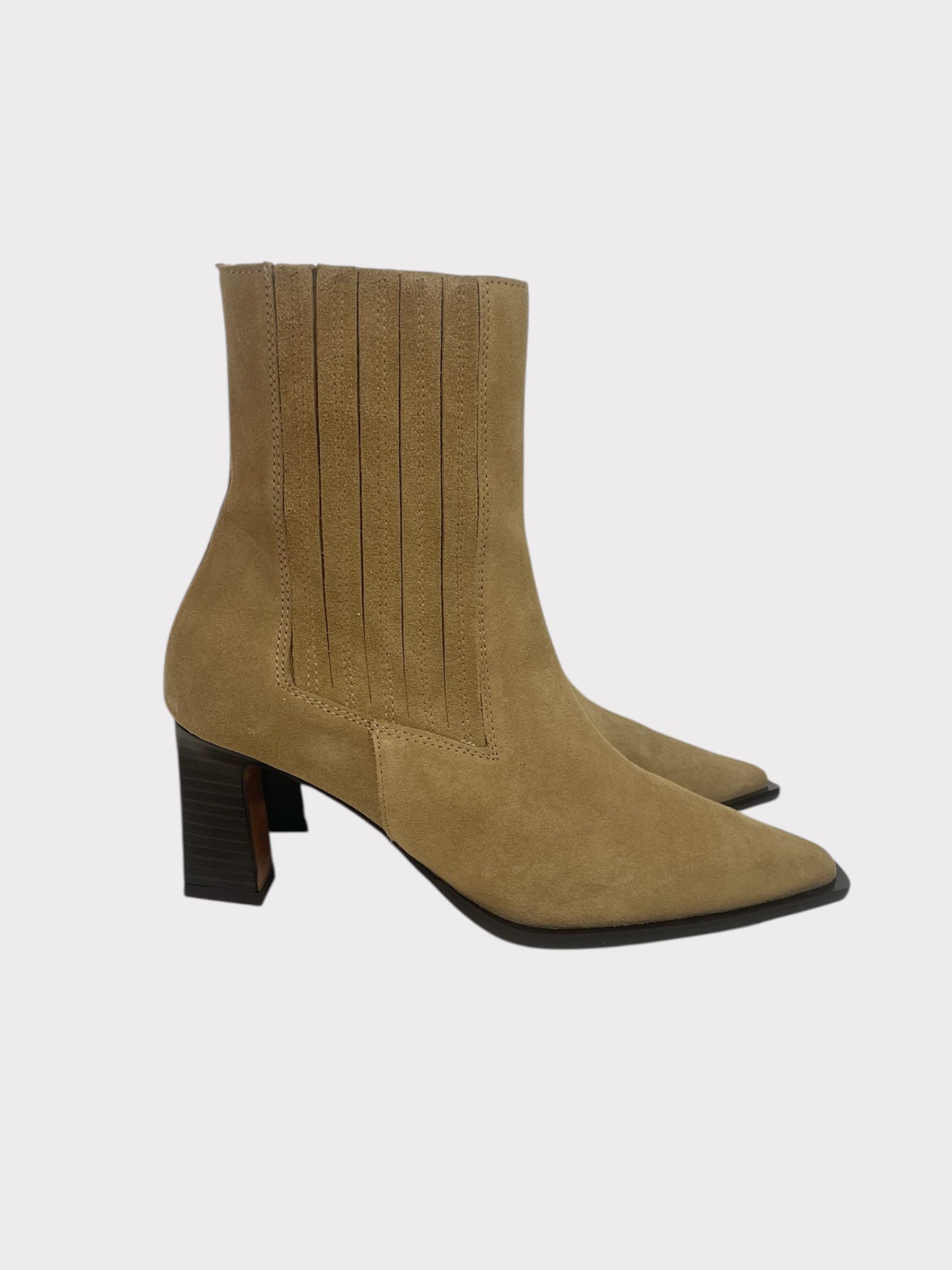 Light beige suede ankle boots with block heel and elastic detail at side