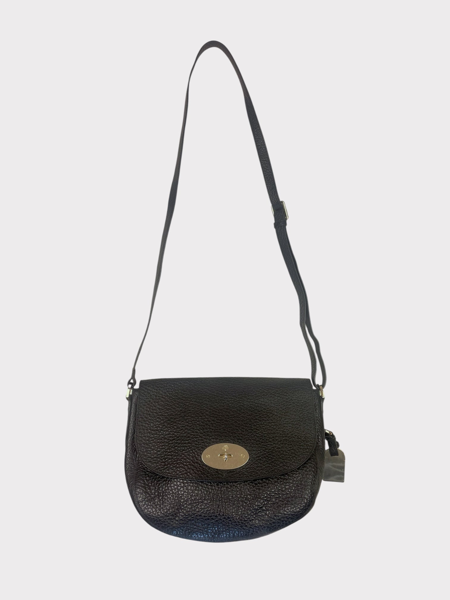 Black pebbled leather shoulder bag with branded postman's lock closure